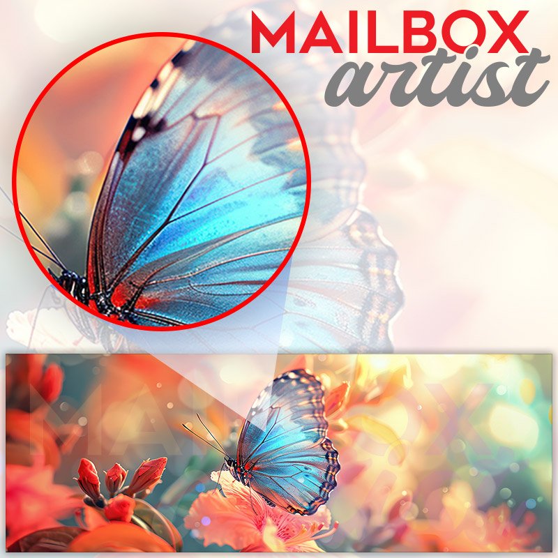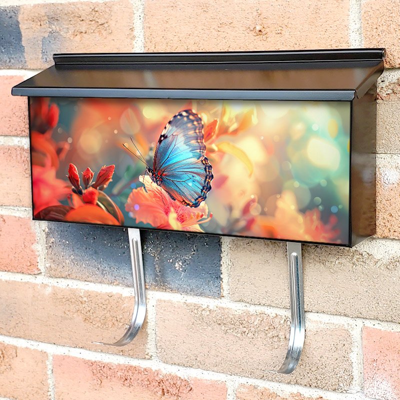 Applying your A Blue Butterfly Flying In A Beautiful Flower townhouse / ranch mailbox cover it’s pretty easy to convert your mailbox to a special and unique item. These covers require a flat surface, so they work with townhouse / ranch mailboxes that do not have any embossed decoration or signs. Magnetic mailbox covers work with steel boxes, for aluminum and plastic boxes we offer the self-adhesive vinyl covers. In case your mailbox doesn’t work with these covers, you can purchase the preinstalled cover on a brand new mailbox as well. Also, you can create your custom townhouse / ranch mailbox cover using you own pictures, adding your name, street number, etc.