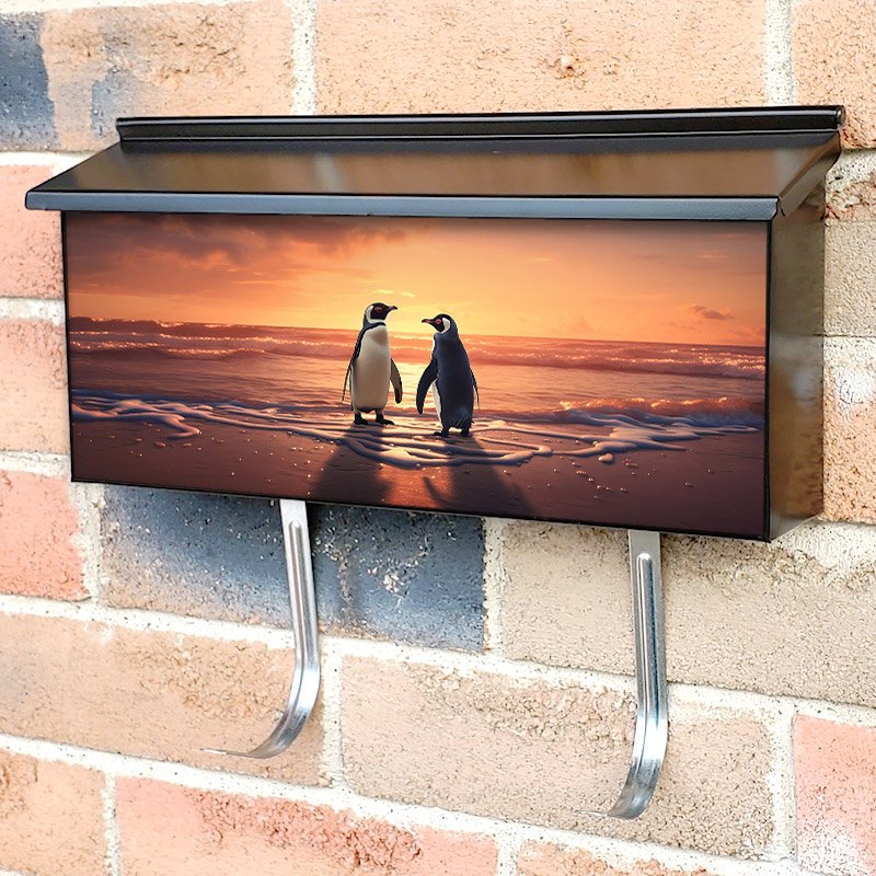 Applying your A Pair Of Penguins Enjoy The Beauty Of The Sunset 3 townhouse / ranch mailbox cover it’s pretty easy to convert your mailbox to a special and unique item. These covers require a flat surface, so they work with townhouse / ranch mailboxes that do not have any embossed decoration or signs. Magnetic mailbox covers work with steel boxes, for aluminum and plastic boxes we offer the self-adhesive vinyl covers. In case your mailbox doesn’t work with these covers, you can purchase the preinstalled cover on a brand new mailbox as well. Also, you can create your custom townhouse / ranch mailbox cover using you own pictures, adding your name, street number, etc.