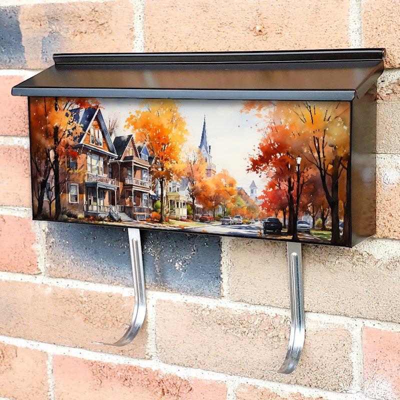Applying your A Vibrant Watercolor Illustration Showcasing A Cozy American City townhouse / ranch mailbox cover it’s pretty easy to convert your mailbox to a special and unique item. These covers require a flat surface, so they work with townhouse / ranch mailboxes that do not have any embossed decoration or signs. Magnetic mailbox covers work with steel boxes, for aluminum and plastic boxes we offer the self-adhesive vinyl covers. In case your mailbox doesn’t work with these covers, you can purchase the preinstalled cover on a brand new mailbox as well. Also, you can create your custom townhouse / ranch mailbox cover using you own pictures, adding your name, street number, etc.