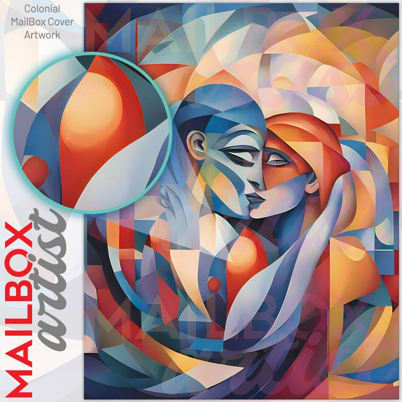 With this Abstract Lovers Portrait colonial mailbox cover it’s pretty easy to convert your mailbox to a special and unique item. These covers require a flat surface, so they work with colonial mailboxes that do not have any embossed decoration or signs. Magnetic mailbox covers work with steel colonial boxes only, while self-adhesive vinyl covers are available for aluminum, plastic and steel boxes. We also offer both self-adhesive and magnetic covers with regular opaque white vinyl or reflective vinyl, which works similarly to license plates or road signs. The reflective option makes the entire cover’s surface reflective, ensuring visibility at night. In case your mailbox doesn’t work with these covers, you can purchase the preinstalled cover on a brand new mailbox as well. Also, you can create your custom colonial mailbox cover using you own pictures, adding your name, street number, etc.