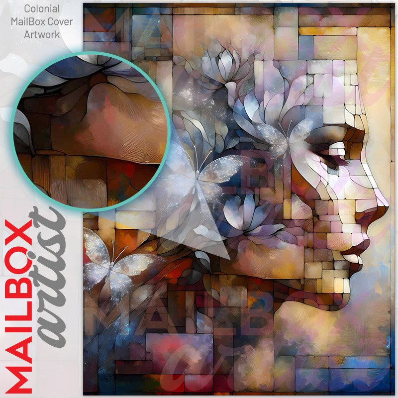 With this Abstract Stained Glass Woman Portrait colonial mailbox cover it’s pretty easy to convert your mailbox to a special and unique item. These covers require a flat surface, so they work with colonial mailboxes that do not have any embossed decoration or signs. Magnetic mailbox covers work with steel colonial boxes only, while self-adhesive vinyl covers are available for aluminum, plastic and steel boxes. We also offer both self-adhesive and magnetic covers with regular opaque white vinyl or reflective vinyl, which works similarly to license plates or road signs. The reflective option makes the entire cover’s surface reflective, ensuring visibility at night. In case your mailbox doesn’t work with these covers, you can purchase the preinstalled cover on a brand new mailbox as well. Also, you can create your custom colonial mailbox cover using you own pictures, adding your name, street number, etc.