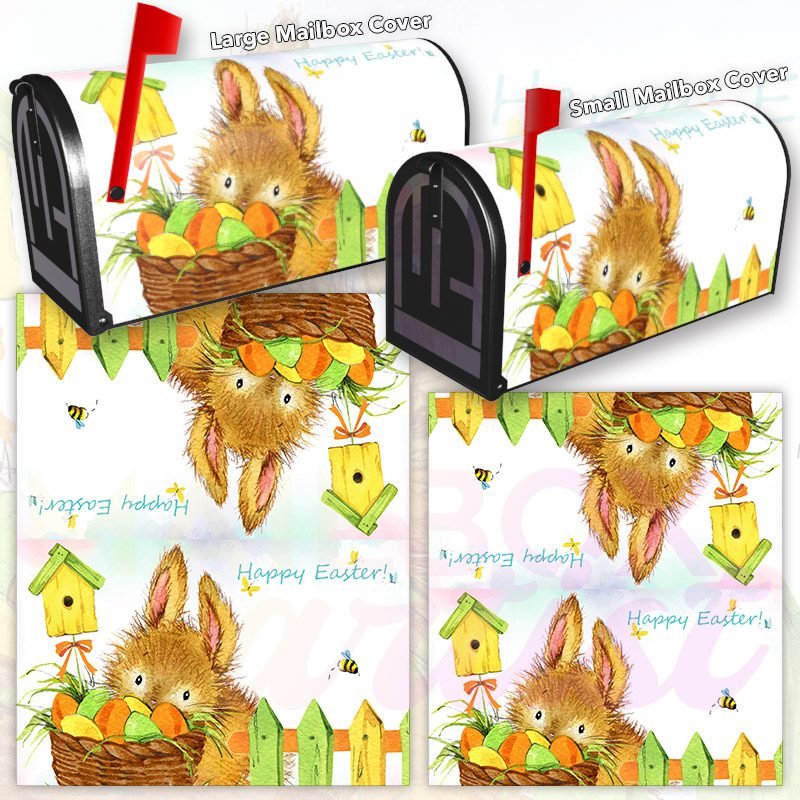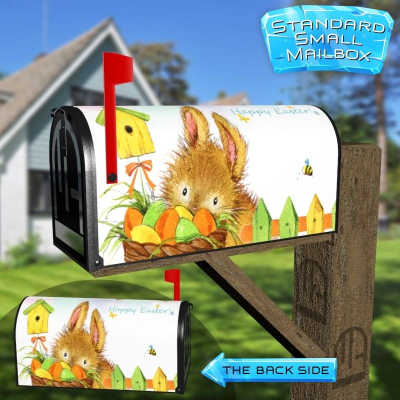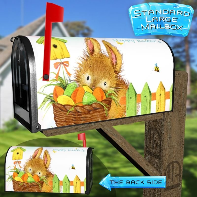 Dressing up your rural farm mailbox with the Adorable Easter Bunny #2 mailbox cover is an easy way to convert it into a unique and special item. These covers require a smooth surface, so they are compatible with rural farm mailboxes that do not have any embossed decorations or signs. Magnetic mailbox covers work with steel boxes only, while self-adhesive vinyl covers are available for aluminum, plastic and steel boxes. If your mailbox is not compatible with these covers, you can purchase a brand new mailbox with a preinstalled cover. Additionally, you have the option to create a custom rural farm mailbox cover with your own pictures, name, street number, etc.