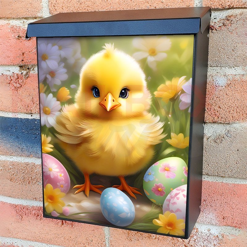 With this Adorable Easter Chick with Eggs colonial mailbox cover it’s pretty easy to convert your mailbox to a special and unique item. These covers require a flat surface, so they work with colonial mailboxes that do not have any embossed decoration or signs. Magnetic mailbox covers work with steel colonial boxes only, while self-adhesive vinyl covers are available for aluminum, plastic and steel boxes. We also offer both self-adhesive and magnetic covers with regular opaque white vinyl or reflective vinyl, which works similarly to license plates or road signs. The reflective option makes the entire cover’s surface reflective, ensuring visibility at night. In case your mailbox doesn’t work with these covers, you can purchase the preinstalled cover on a brand new mailbox as well. Also, you can create your custom colonial mailbox cover using you own pictures, adding your name, street number, etc.