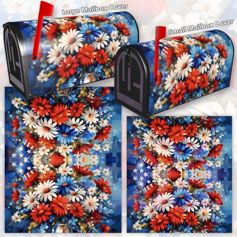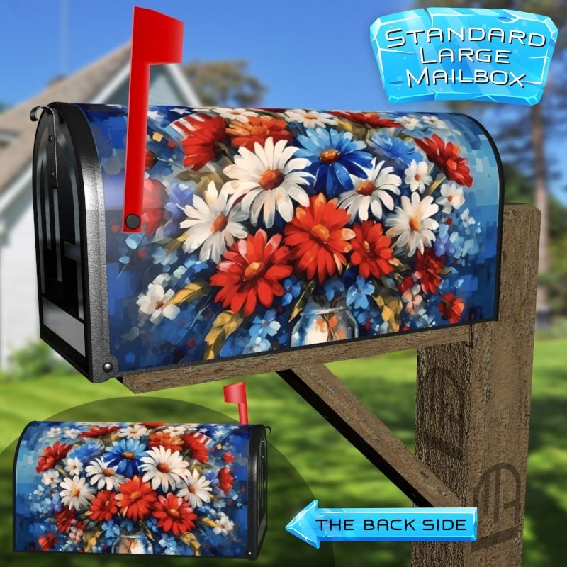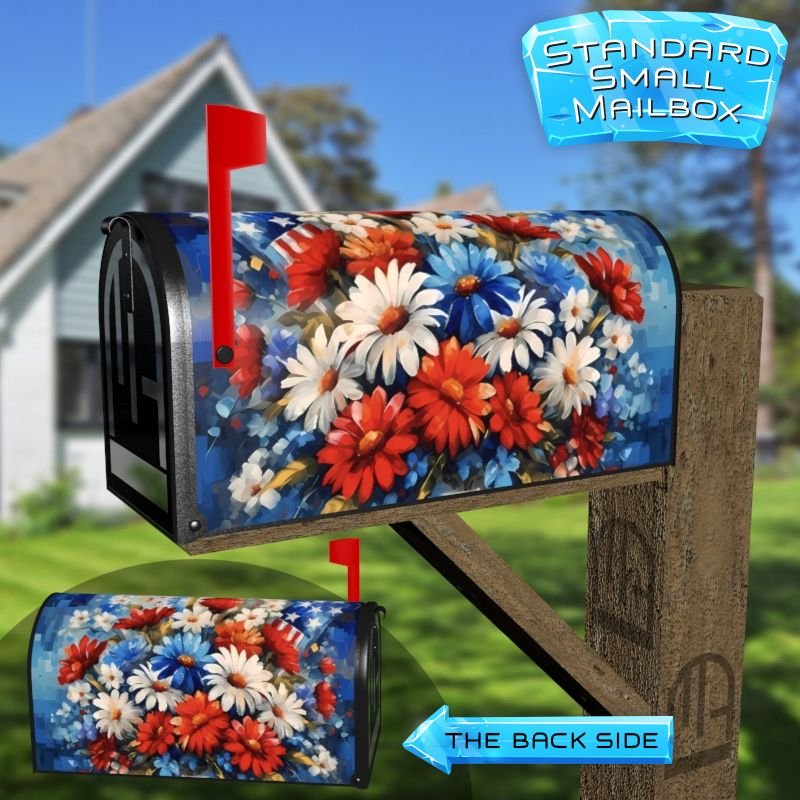 Dressing up your rural farm mailbox with the American Flag and Flowers #1 mailbox cover is an easy way to convert it into a unique and special item. These covers require a smooth surface, so they are compatible with rural farm mailboxes that do not have any embossed decorations or signs. Magnetic mailbox covers work with steel boxes only, while self-adhesive vinyl covers are available for aluminum, plastic and steel boxes. If your mailbox is not compatible with these covers, you can purchase a brand new mailbox with a preinstalled cover. Additionally, you have the option to create a custom rural farm mailbox cover with your own pictures, name, street number, etc.