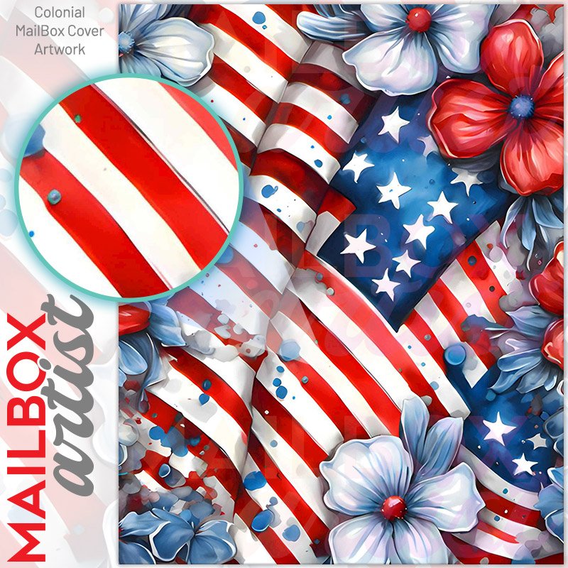 With this American Flag with Little Flowers colonial mailbox cover it’s pretty easy to convert your mailbox to a special and unique item. These covers require a flat surface, so they work with colonial mailboxes that do not have any embossed decoration or signs. Magnetic mailbox covers work with steel colonial boxes only, while self-adhesive vinyl covers are available for aluminum, plastic and steel boxes. We also offer both self-adhesive and magnetic covers with regular opaque white vinyl or reflective vinyl, which works similarly to license plates or road signs. The reflective option makes the entire cover’s surface reflective, ensuring visibility at night. In case your mailbox doesn’t work with these covers, you can purchase the preinstalled cover on a brand new mailbox as well. Also, you can create your custom colonial mailbox cover using you own pictures, adding your name, street number, etc.