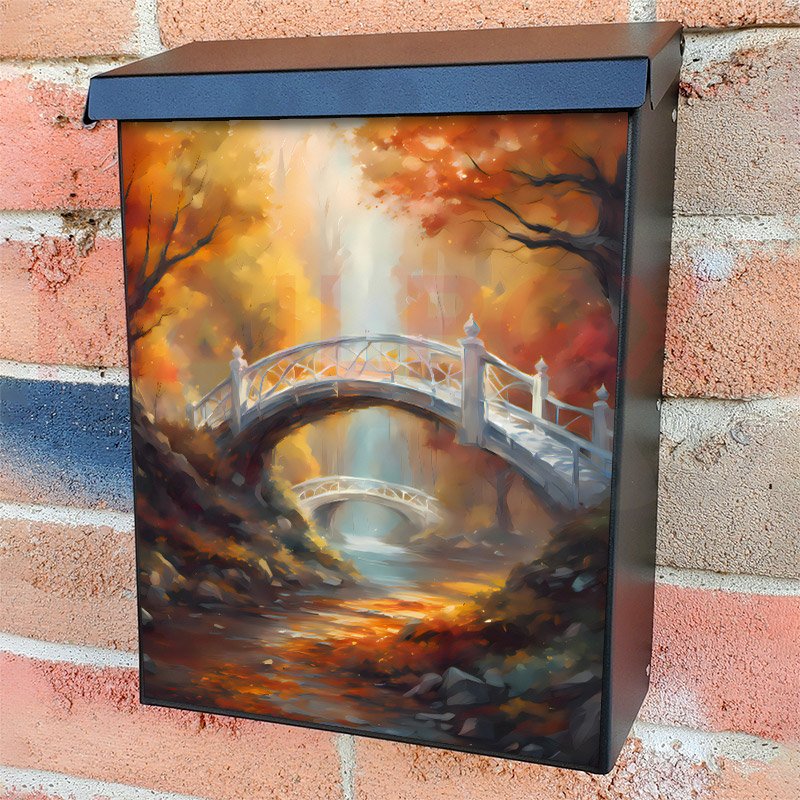 This Autumn Bridge in the Woods mailbox design was created by Krisztina Soos