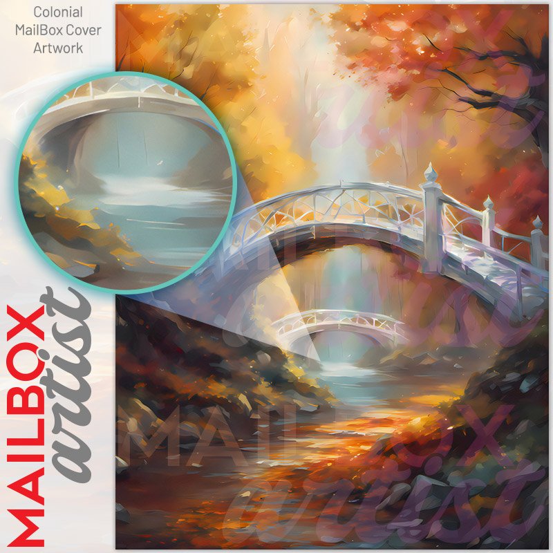 With this Autumn Bridge in the Woods colonial mailbox cover it’s pretty easy to convert your mailbox to a special and unique item. These covers require a flat surface, so they work with colonial mailboxes that do not have any embossed decoration or signs. Magnetic mailbox covers work with steel colonial boxes only, while self-adhesive vinyl covers are available for aluminum, plastic and steel boxes. We also offer both self-adhesive and magnetic covers with regular opaque white vinyl or reflective vinyl, which works similarly to license plates or road signs. The reflective option makes the entire cover’s surface reflective, ensuring visibility at night. In case your mailbox doesn’t work with these covers, you can purchase the preinstalled cover on a brand new mailbox as well. Also, you can create your custom colonial mailbox cover using you own pictures, adding your name, street number, etc.