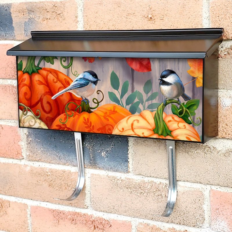 Applying your Autumn Pumpkin Chickadees #2 townhouse / ranch mailbox cover it’s pretty easy to convert your mailbox to a special and unique item. These covers require a flat surface, so they work with townhouse / ranch mailboxes that do not have any embossed decoration or signs. Magnetic mailbox covers work with steel boxes, for aluminum and plastic boxes we offer the self-adhesive vinyl covers. In case your mailbox doesn’t work with these covers, you can purchase the preinstalled cover on a brand new mailbox as well. Also, you can create your custom townhouse / ranch mailbox cover using you own pictures, adding your name, street number, etc.