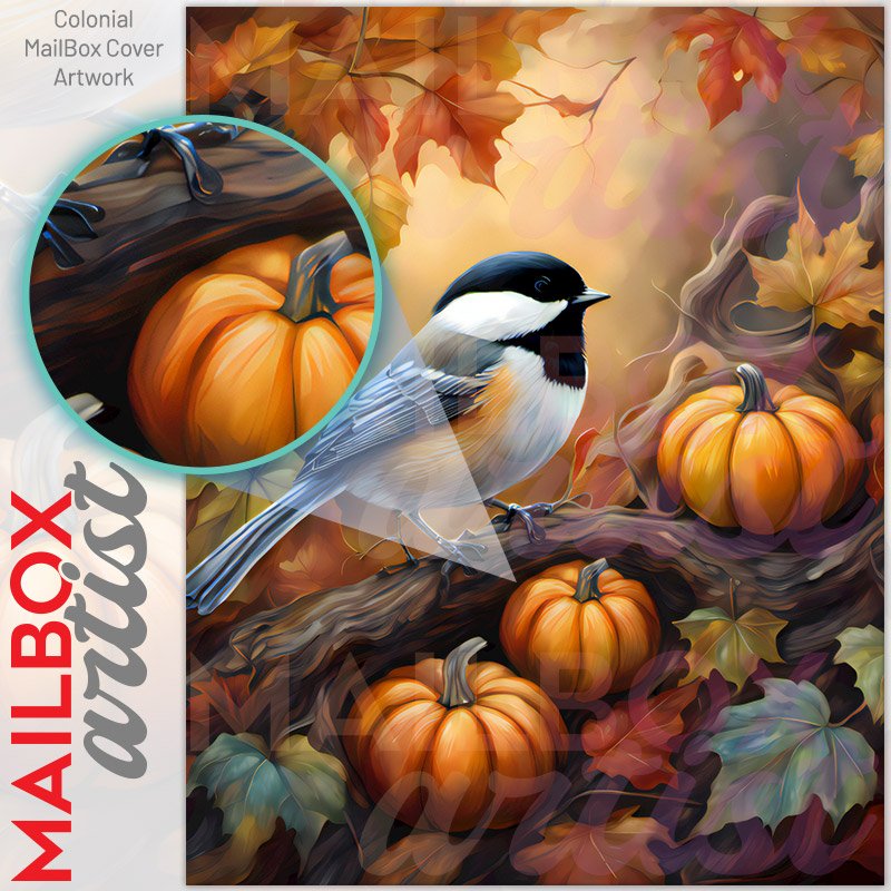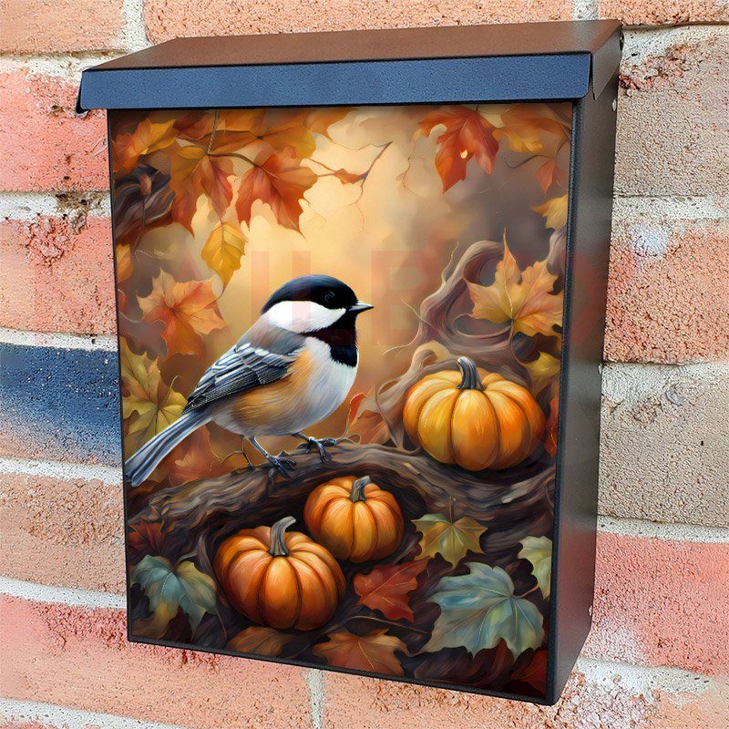 This Autumn Pumpkins and Chickadee mailbox design was created by Krisztina Soos