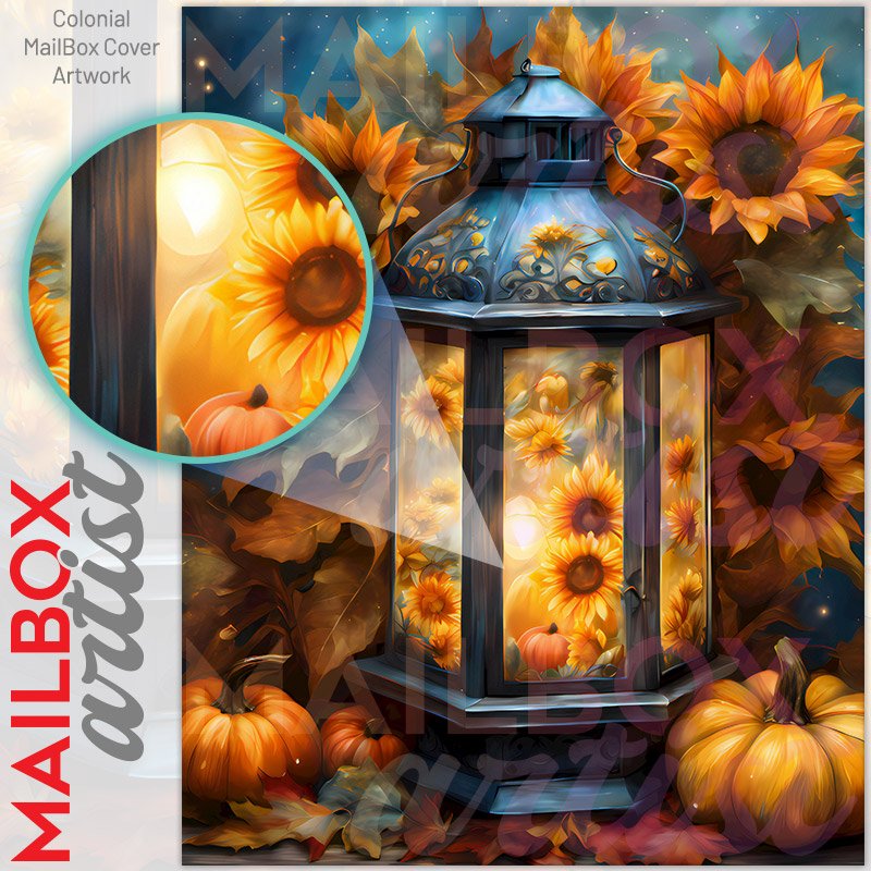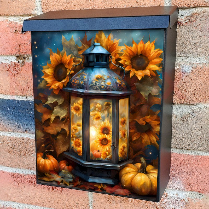 With this Autumn Sunflower Lantern colonial mailbox cover it’s pretty easy to convert your mailbox to a special and unique item. These covers require a flat surface, so they work with colonial mailboxes that do not have any embossed decoration or signs. Magnetic mailbox covers work with steel colonial boxes only, while self-adhesive vinyl covers are available for aluminum, plastic and steel boxes. We also offer both self-adhesive and magnetic covers with regular opaque white vinyl or reflective vinyl, which works similarly to license plates or road signs. The reflective option makes the entire cover’s surface reflective, ensuring visibility at night. In case your mailbox doesn’t work with these covers, you can purchase the preinstalled cover on a brand new mailbox as well. Also, you can create your custom colonial mailbox cover using you own pictures, adding your name, street number, etc.