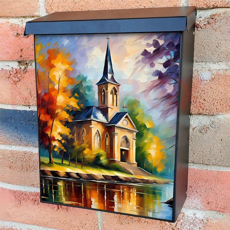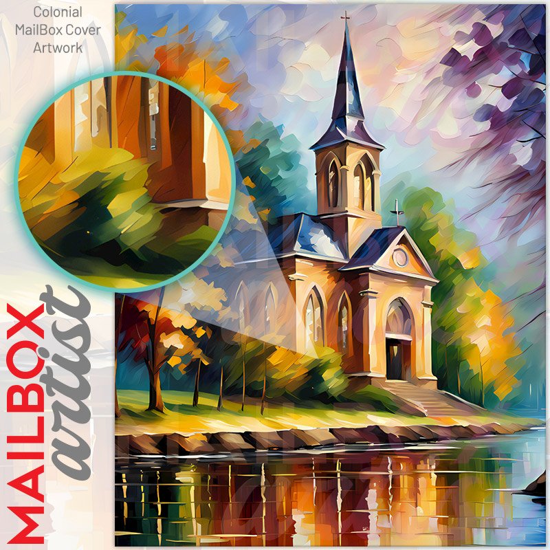 With this Autumn Trees and Church colonial mailbox cover it’s pretty easy to convert your mailbox to a special and unique item. These covers require a flat surface, so they work with colonial mailboxes that do not have any embossed decoration or signs. Magnetic mailbox covers work with steel colonial boxes only, while self-adhesive vinyl covers are available for aluminum, plastic and steel boxes. We also offer both self-adhesive and magnetic covers with regular opaque white vinyl or reflective vinyl, which works similarly to license plates or road signs. The reflective option makes the entire cover’s surface reflective, ensuring visibility at night. In case your mailbox doesn’t work with these covers, you can purchase the preinstalled cover on a brand new mailbox as well. Also, you can create your custom colonial mailbox cover using you own pictures, adding your name, street number, etc.