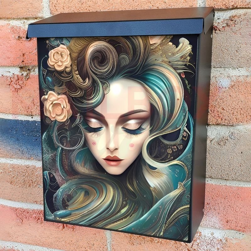With this Beautiful Blue Hair Girl colonial mailbox cover it’s pretty easy to convert your mailbox to a special and unique item. These covers require a flat surface, so they work with colonial mailboxes that do not have any embossed decoration or signs. In case your mailbox doesn’t work with these covers, you can purchase the preinstalled cover on a brand new mailbox as well. Also, you can create your custom colonial mailbox cover using you own pictures, adding your name, street number, etc.