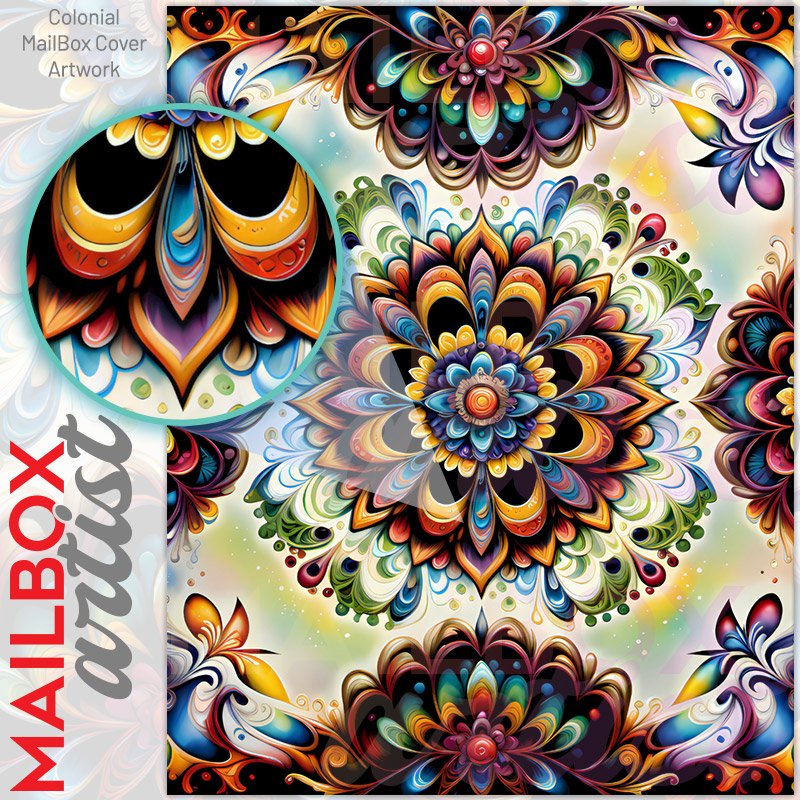 With this Beautiful Boho Mandala Art colonial mailbox cover it’s pretty easy to convert your mailbox to a special and unique item. These covers require a flat surface, so they work with colonial mailboxes that do not have any embossed decoration or signs. Magnetic mailbox covers work with steel colonial boxes only, while self-adhesive vinyl covers are available for aluminum, plastic and steel boxes. We also offer both self-adhesive and magnetic covers with regular opaque white vinyl or reflective vinyl, which works similarly to license plates or road signs. The reflective option makes the entire cover’s surface reflective, ensuring visibility at night. In case your mailbox doesn’t work with these covers, you can purchase the preinstalled cover on a brand new mailbox as well. Also, you can create your custom colonial mailbox cover using you own pictures, adding your name, street number, etc.