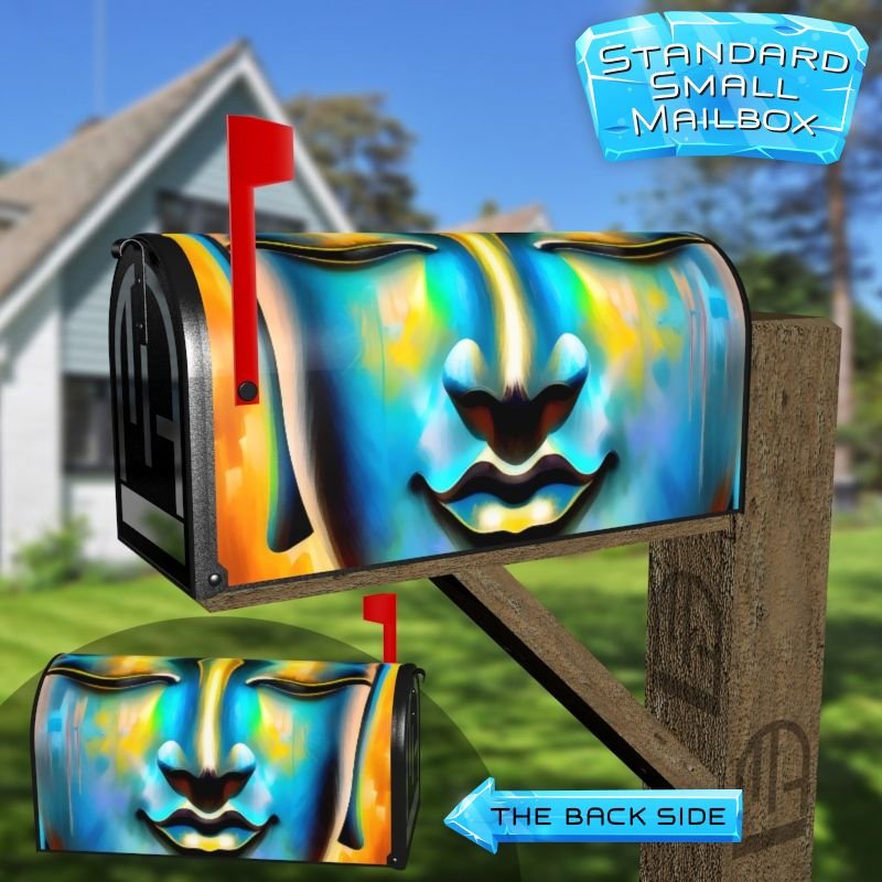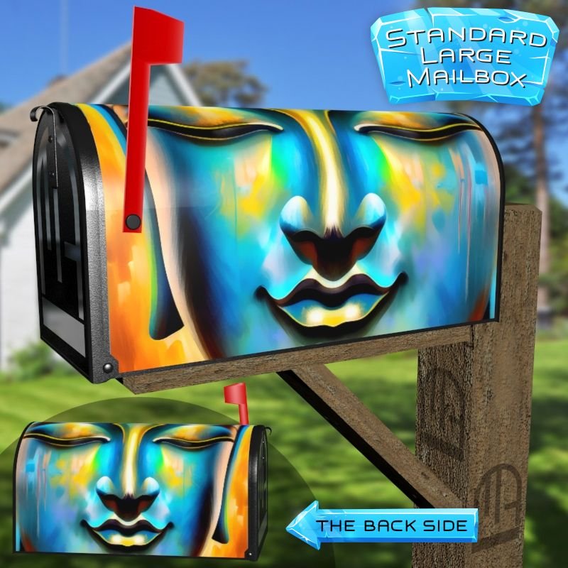 Dressing up your rural farm mailbox with the Beautiful Buddha Face #8 mailbox cover is an easy way to convert it into a unique and special item. These covers require a smooth surface, so they are compatible with rural farm mailboxes that do not have any embossed decorations or signs. Magnetic mailbox covers work with steel boxes only, while self-adhesive vinyl covers are available for aluminum, plastic and steel boxes. If your mailbox is not compatible with these covers, you can purchase a brand new mailbox with a preinstalled cover. Additionally, you have the option to create a custom rural farm mailbox cover with your own pictures, name, street number, etc.