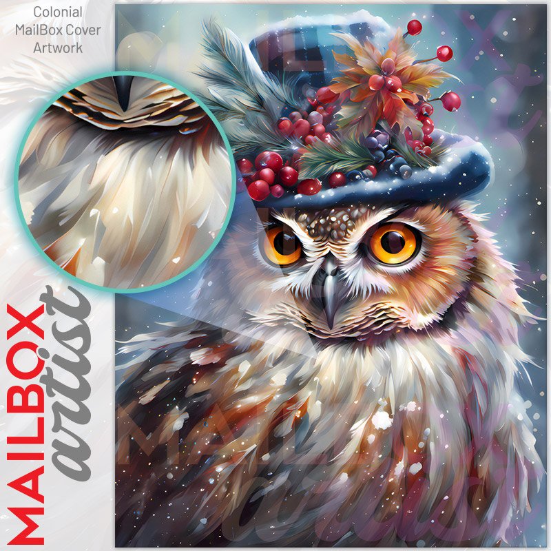 With this Beautiful Christmas Owl in Top Hat colonial mailbox cover it’s pretty easy to convert your mailbox to a special and unique item. These covers require a flat surface, so they work with colonial mailboxes that do not have any embossed decoration or signs. Magnetic mailbox covers work with steel colonial boxes only, while self-adhesive vinyl covers are available for aluminum, plastic and steel boxes. We also offer both self-adhesive and magnetic covers with regular opaque white vinyl or reflective vinyl, which works similarly to license plates or road signs. The reflective option makes the entire cover’s surface reflective, ensuring visibility at night. In case your mailbox doesn’t work with these covers, you can purchase the preinstalled cover on a brand new mailbox as well. Also, you can create your custom colonial mailbox cover using you own pictures, adding your name, street number, etc.