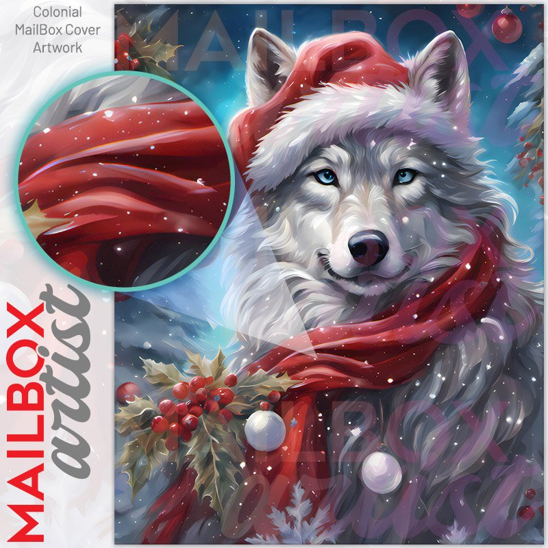 With this Beautiful Christmas Wolf colonial mailbox cover it’s pretty easy to convert your mailbox to a special and unique item. These covers require a flat surface, so they work with colonial mailboxes that do not have any embossed decoration or signs. Magnetic mailbox covers work with steel colonial boxes only, while self-adhesive vinyl covers are available for aluminum, plastic and steel boxes. We also offer both self-adhesive and magnetic covers with regular opaque white vinyl or reflective vinyl, which works similarly to license plates or road signs. The reflective option makes the entire cover’s surface reflective, ensuring visibility at night. In case your mailbox doesn’t work with these covers, you can purchase the preinstalled cover on a brand new mailbox as well. Also, you can create your custom colonial mailbox cover using you own pictures, adding your name, street number, etc.