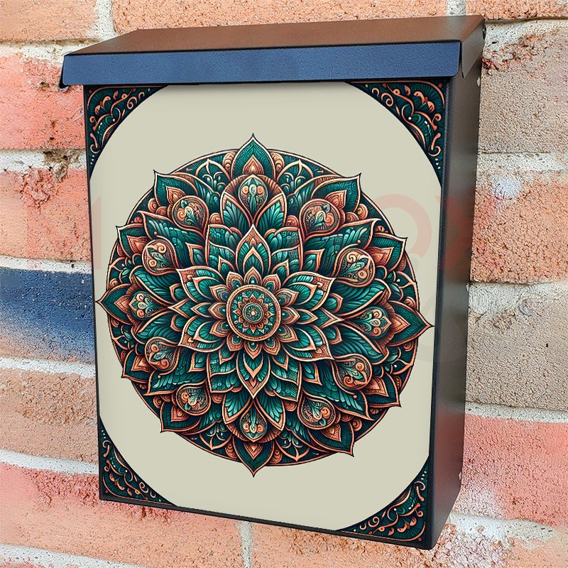 With this Beautiful Copper and Teal Mandala colonial mailbox cover it’s pretty easy to convert your mailbox to a special and unique item. These covers require a flat surface, so they work with colonial mailboxes that do not have any embossed decoration or signs. Magnetic mailbox covers work with steel colonial boxes only, while self-adhesive vinyl covers are available for aluminum, plastic and steel boxes. We also offer both self-adhesive and magnetic covers with regular opaque white vinyl or reflective vinyl, which works similarly to license plates or road signs. The reflective option makes the entire cover’s surface reflective, ensuring visibility at night. In case your mailbox doesn’t work with these covers, you can purchase the preinstalled cover on a brand new mailbox as well. Also, you can create your custom colonial mailbox cover using you own pictures, adding your name, street number, etc.