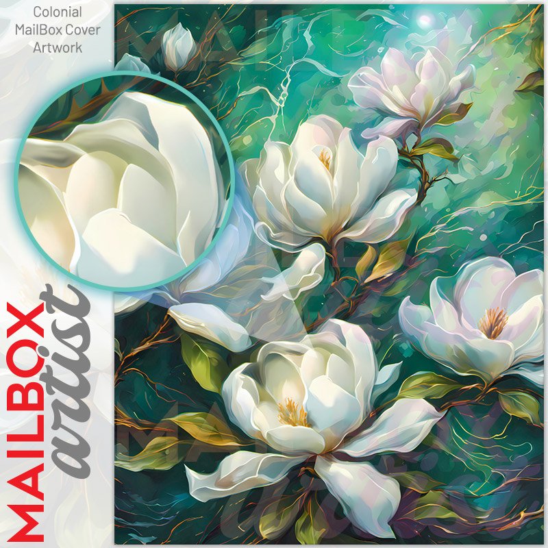 With this Beautiful Magnolias in the Wind colonial mailbox cover it’s pretty easy to convert your mailbox to a special and unique item. These covers require a flat surface, so they work with colonial mailboxes that do not have any embossed decoration or signs. Magnetic mailbox covers work with steel colonial boxes only, while self-adhesive vinyl covers are available for aluminum, plastic and steel boxes. We also offer both self-adhesive and magnetic covers with regular opaque white vinyl or reflective vinyl, which works similarly to license plates or road signs. The reflective option makes the entire cover’s surface reflective, ensuring visibility at night. In case your mailbox doesn’t work with these covers, you can purchase the preinstalled cover on a brand new mailbox as well. Also, you can create your custom colonial mailbox cover using you own pictures, adding your name, street number, etc.