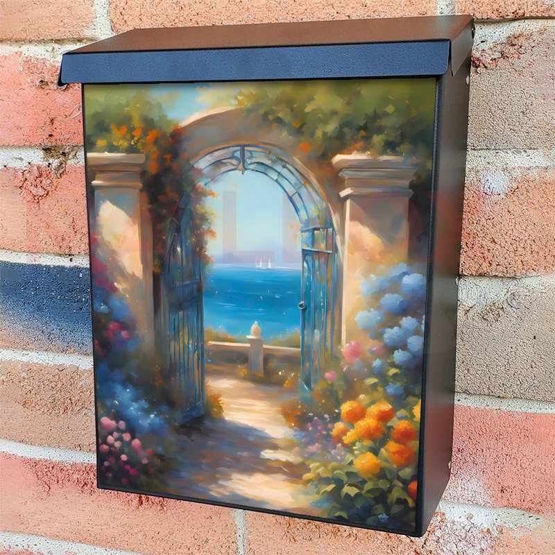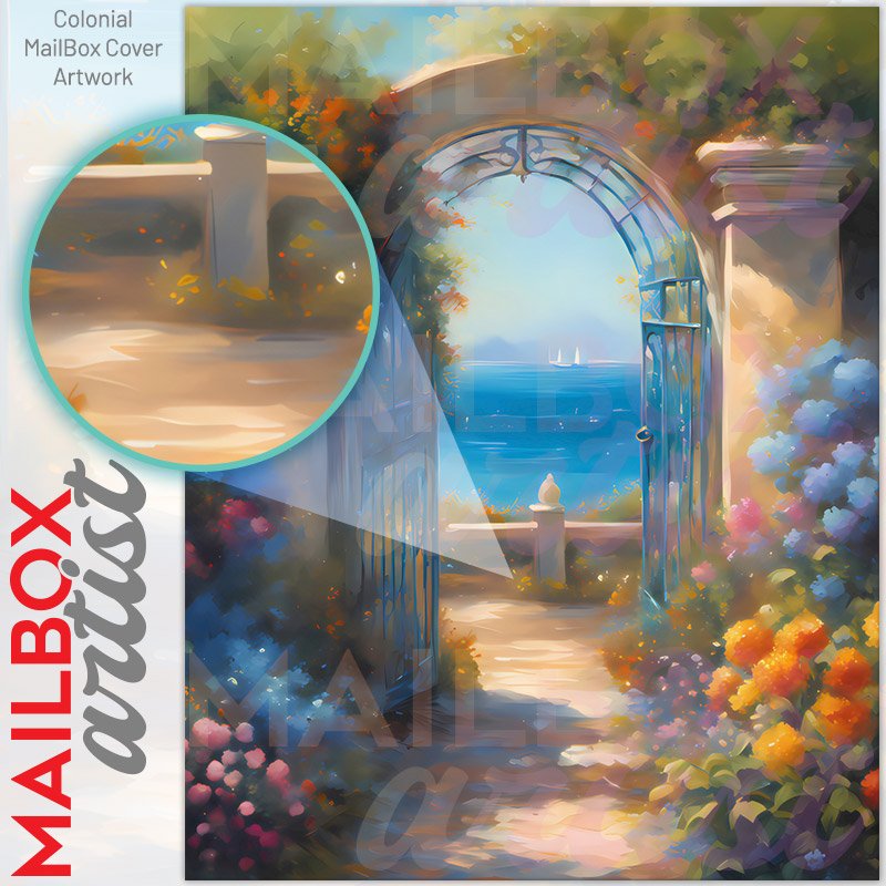 With this Beautiful Mediterranean Gate colonial mailbox cover it’s pretty easy to convert your mailbox to a special and unique item. These covers require a flat surface, so they work with colonial mailboxes that do not have any embossed decoration or signs. Magnetic mailbox covers work with steel colonial boxes only, while self-adhesive vinyl covers are available for aluminum, plastic and steel boxes. We also offer both self-adhesive and magnetic covers with regular opaque white vinyl or reflective vinyl, which works similarly to license plates or road signs. The reflective option makes the entire cover’s surface reflective, ensuring visibility at night. In case your mailbox doesn’t work with these covers, you can purchase the preinstalled cover on a brand new mailbox as well. Also, you can create your custom colonial mailbox cover using you own pictures, adding your name, street number, etc.