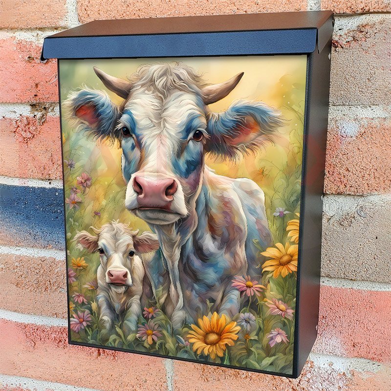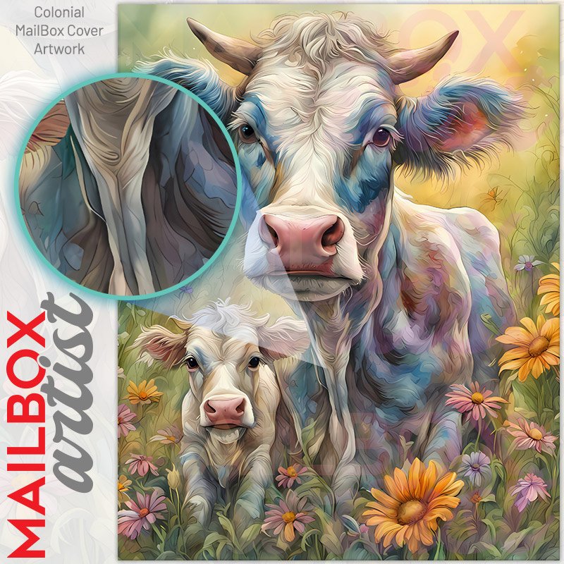 With this Beautiful Mom and Baby Cow colonial mailbox cover it’s pretty easy to convert your mailbox to a special and unique item. These covers require a flat surface, so they work with colonial mailboxes that do not have any embossed decoration or signs. Magnetic mailbox covers work with steel colonial boxes only, while self-adhesive vinyl covers are available for aluminum, plastic and steel boxes. We also offer both self-adhesive and magnetic covers with regular opaque white vinyl or reflective vinyl, which works similarly to license plates or road signs. The reflective option makes the entire cover’s surface reflective, ensuring visibility at night. In case your mailbox doesn’t work with these covers, you can purchase the preinstalled cover on a brand new mailbox as well. Also, you can create your custom colonial mailbox cover using you own pictures, adding your name, street number, etc.