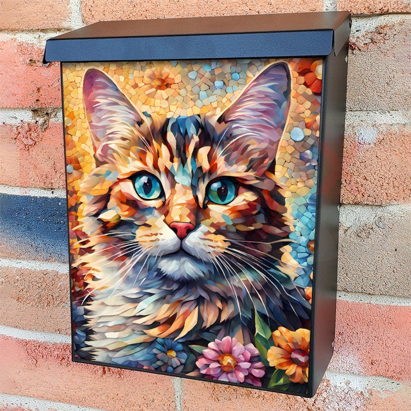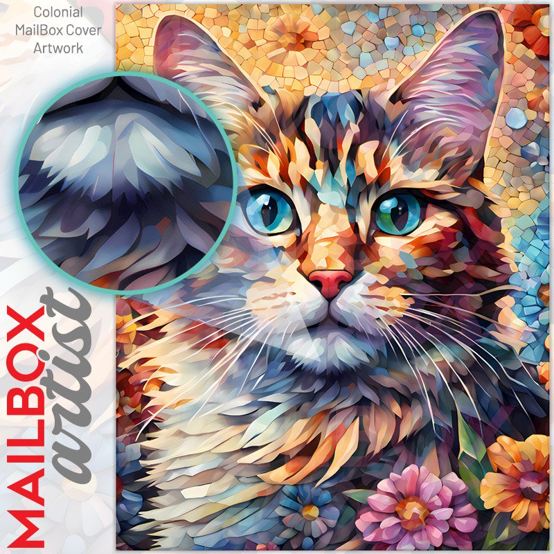 With this Beautiful Mosaic Cat colonial mailbox cover it’s pretty easy to convert your mailbox to a special and unique item. These covers require a flat surface, so they work with colonial mailboxes that do not have any embossed decoration or signs. Magnetic mailbox covers work with steel colonial boxes only, while self-adhesive vinyl covers are available for aluminum, plastic and steel boxes. We also offer both self-adhesive and magnetic covers with regular opaque white vinyl or reflective vinyl, which works similarly to license plates or road signs. The reflective option makes the entire cover’s surface reflective, ensuring visibility at night. In case your mailbox doesn’t work with these covers, you can purchase the preinstalled cover on a brand new mailbox as well. Also, you can create your custom colonial mailbox cover using you own pictures, adding your name, street number, etc.