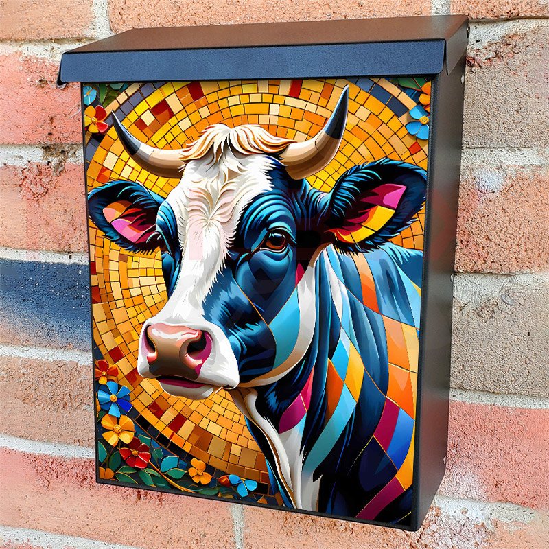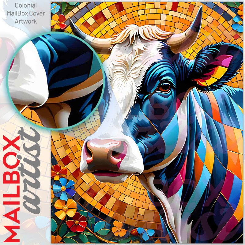 With this Beautiful Mosaic Cow colonial mailbox cover it’s pretty easy to convert your mailbox to a special and unique item. These covers require a flat surface, so they work with colonial mailboxes that do not have any embossed decoration or signs. Magnetic mailbox covers work with steel colonial boxes only, while self-adhesive vinyl covers are available for aluminum, plastic and steel boxes. We also offer both self-adhesive and magnetic covers with regular opaque white vinyl or reflective vinyl, which works similarly to license plates or road signs. The reflective option makes the entire cover’s surface reflective, ensuring visibility at night. In case your mailbox doesn’t work with these covers, you can purchase the preinstalled cover on a brand new mailbox as well. Also, you can create your custom colonial mailbox cover using you own pictures, adding your name, street number, etc.