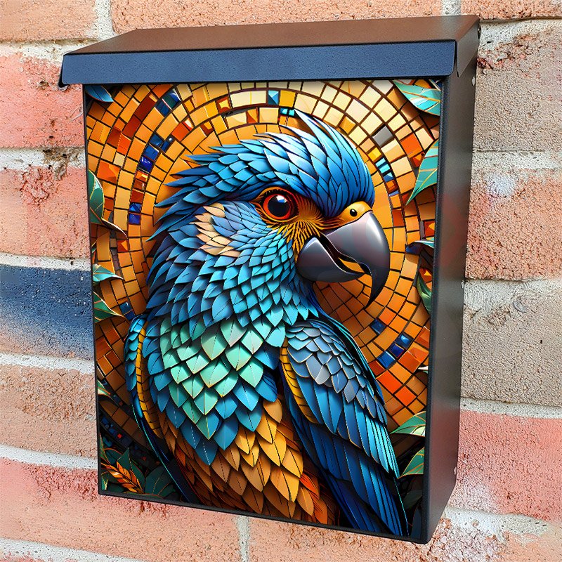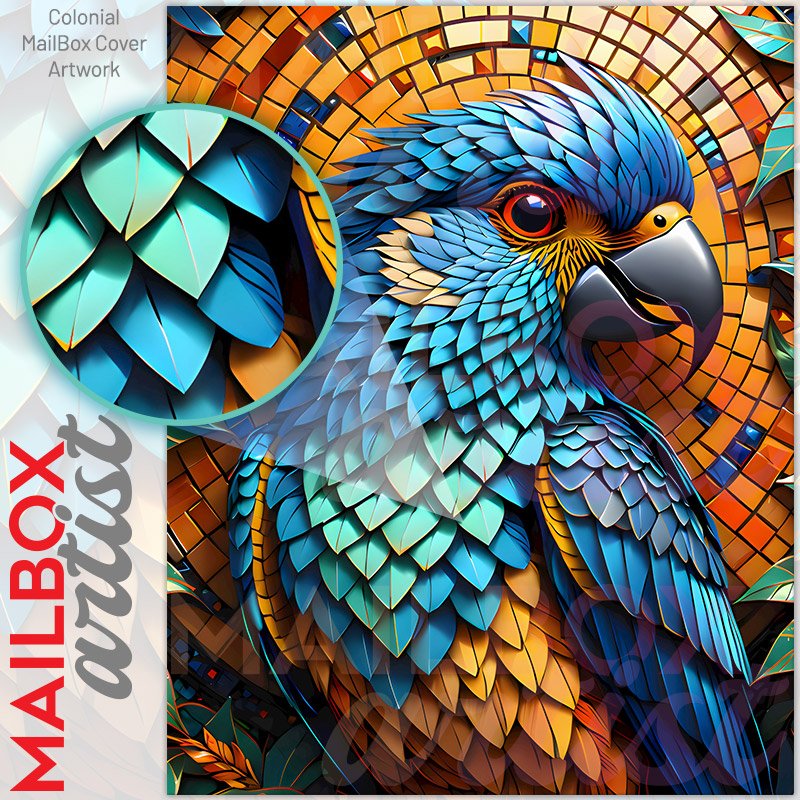 With this Beautiful Mosaic Parrot colonial mailbox cover it’s pretty easy to convert your mailbox to a special and unique item. These covers require a flat surface, so they work with colonial mailboxes that do not have any embossed decoration or signs. Magnetic mailbox covers work with steel colonial boxes only, while self-adhesive vinyl covers are available for aluminum, plastic and steel boxes. We also offer both self-adhesive and magnetic covers with regular opaque white vinyl or reflective vinyl, which works similarly to license plates or road signs. The reflective option makes the entire cover’s surface reflective, ensuring visibility at night. In case your mailbox doesn’t work with these covers, you can purchase the preinstalled cover on a brand new mailbox as well. Also, you can create your custom colonial mailbox cover using you own pictures, adding your name, street number, etc.