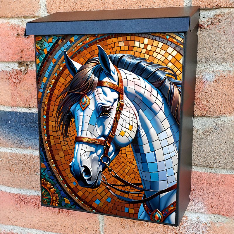With this Beautiful Mosaic White Stallion colonial mailbox cover it’s pretty easy to convert your mailbox to a special and unique item. These covers require a flat surface, so they work with colonial mailboxes that do not have any embossed decoration or signs. Magnetic mailbox covers work with steel colonial boxes only, while self-adhesive vinyl covers are available for aluminum, plastic and steel boxes. We also offer both self-adhesive and magnetic covers with regular opaque white vinyl or reflective vinyl, which works similarly to license plates or road signs. The reflective option makes the entire cover’s surface reflective, ensuring visibility at night. In case your mailbox doesn’t work with these covers, you can purchase the preinstalled cover on a brand new mailbox as well. Also, you can create your custom colonial mailbox cover using you own pictures, adding your name, street number, etc.