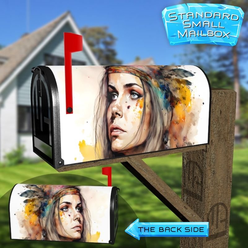 Dressing up your rural farm mailbox with the Beautiful Native Girl #7 mailbox cover is an easy way to convert it into a unique and special item. These covers require a smooth surface, so they are compatible with rural farm mailboxes that do not have any embossed decorations or signs. Magnetic mailbox covers work with steel boxes only, while self-adhesive vinyl covers are available for aluminum, plastic and steel boxes. If your mailbox is not compatible with these covers, you can purchase a brand new mailbox with a preinstalled cover. Additionally, you have the option to create a custom rural farm mailbox cover with your own pictures, name, street number, etc.