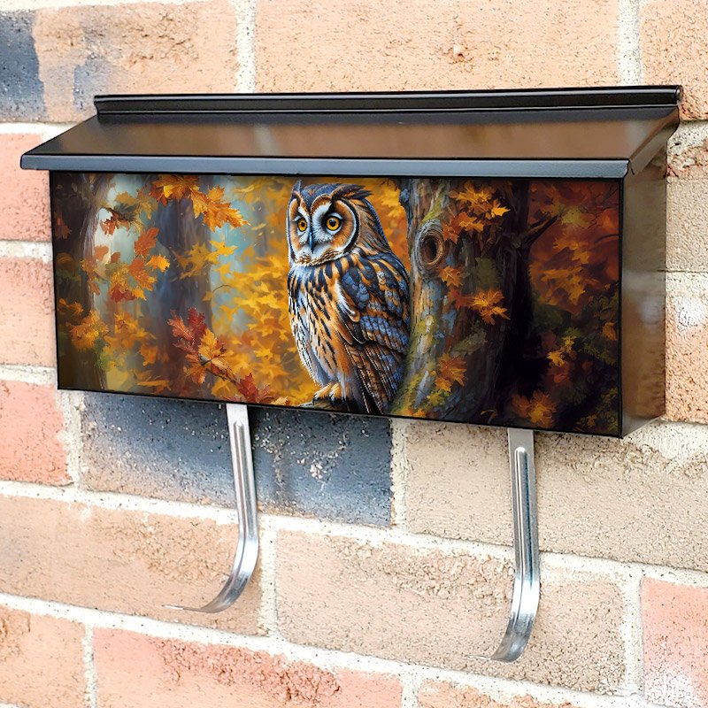 Applying your Beautiful Owl in the Autumn Forest townhouse / ranch mailbox cover it’s pretty easy to convert your mailbox to a special and unique item. These covers require a flat surface, so they work with townhouse / ranch mailboxes that do not have any embossed decoration or signs. Magnetic mailbox covers work with steel boxes, for aluminum and plastic boxes we offer the self-adhesive vinyl covers. In case your mailbox doesn’t work with these covers, you can purchase the preinstalled cover on a brand new mailbox as well. Also, you can create your custom townhouse / ranch mailbox cover using you own pictures, adding your name, street number, etc.