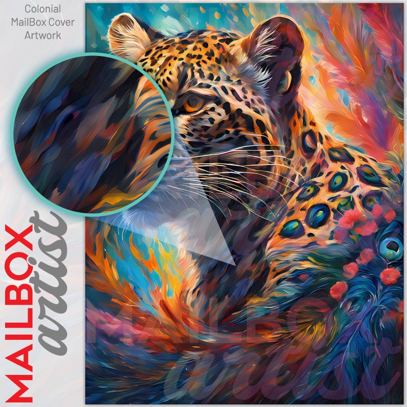 With this Beautiful Peacock Leopard colonial mailbox cover it’s pretty easy to convert your mailbox to a special and unique item. These covers require a flat surface, so they work with colonial mailboxes that do not have any embossed decoration or signs. Magnetic mailbox covers work with steel colonial boxes only, while self-adhesive vinyl covers are available for aluminum, plastic and steel boxes. We also offer both self-adhesive and magnetic covers with regular opaque white vinyl or reflective vinyl, which works similarly to license plates or road signs. The reflective option makes the entire cover’s surface reflective, ensuring visibility at night. In case your mailbox doesn’t work with these covers, you can purchase the preinstalled cover on a brand new mailbox as well. Also, you can create your custom colonial mailbox cover using you own pictures, adding your name, street number, etc.