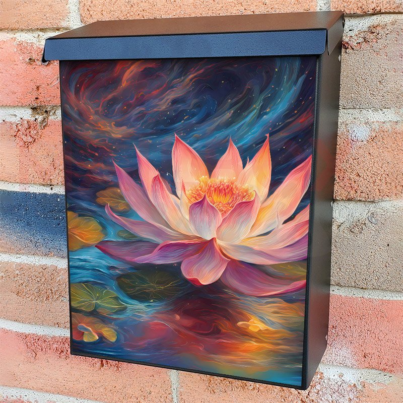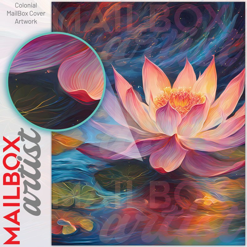 With this Beautiful Pink Lotus colonial mailbox cover it’s pretty easy to convert your mailbox to a special and unique item. These covers require a flat surface, so they work with colonial mailboxes that do not have any embossed decoration or signs. Magnetic mailbox covers work with steel colonial boxes only, while self-adhesive vinyl covers are available for aluminum, plastic and steel boxes. We also offer both self-adhesive and magnetic covers with regular opaque white vinyl or reflective vinyl, which works similarly to license plates or road signs. The reflective option makes the entire cover’s surface reflective, ensuring visibility at night. In case your mailbox doesn’t work with these covers, you can purchase the preinstalled cover on a brand new mailbox as well. Also, you can create your custom colonial mailbox cover using you own pictures, adding your name, street number, etc.