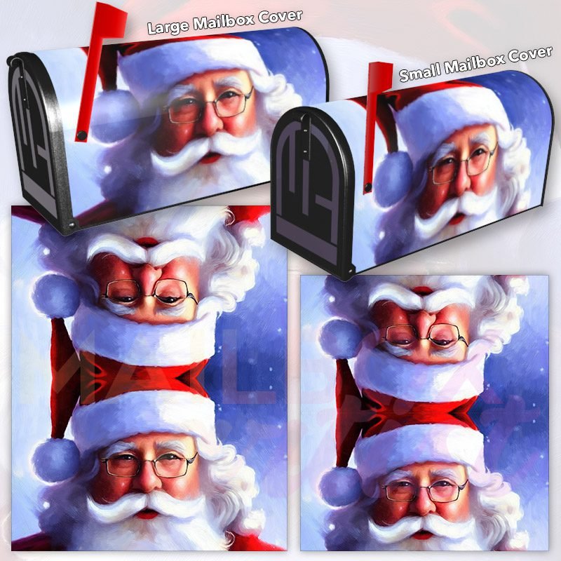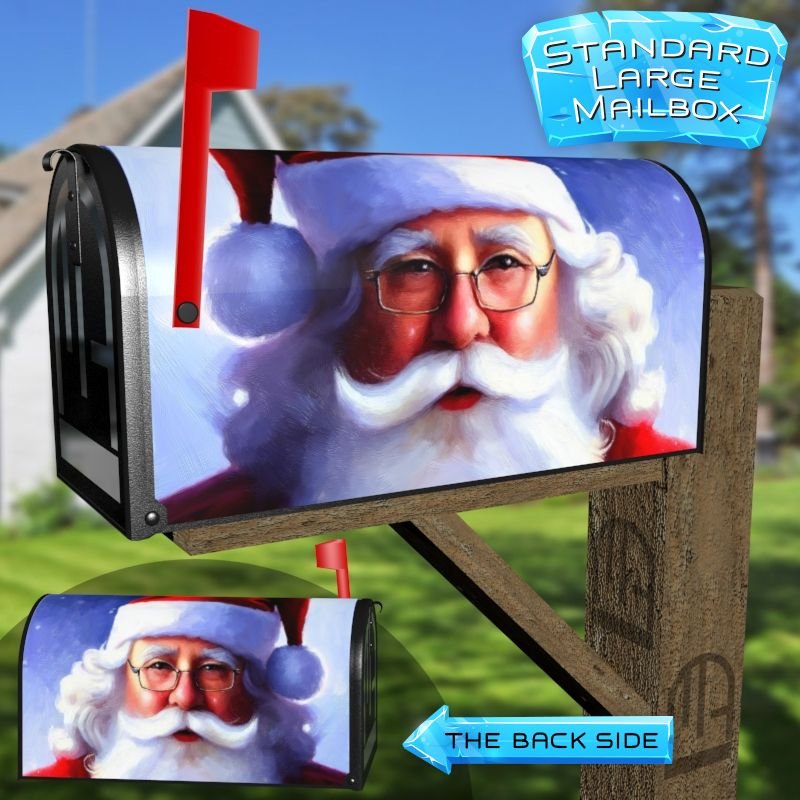 Dressing up your rural farm mailbox with the Beautiful Santa Claus Painting #1 mailbox cover is an easy way to convert it into a unique and special item. These covers require a smooth surface, so they are compatible with rural farm mailboxes that do not have any embossed decorations or signs. Magnetic mailbox covers work with steel boxes only, while self-adhesive vinyl covers are available for aluminum, plastic and steel boxes. If your mailbox is not compatible with these covers, you can purchase a brand new mailbox with a preinstalled cover. Additionally, you have the option to create a custom rural farm mailbox cover with your own pictures, name, street number, etc.