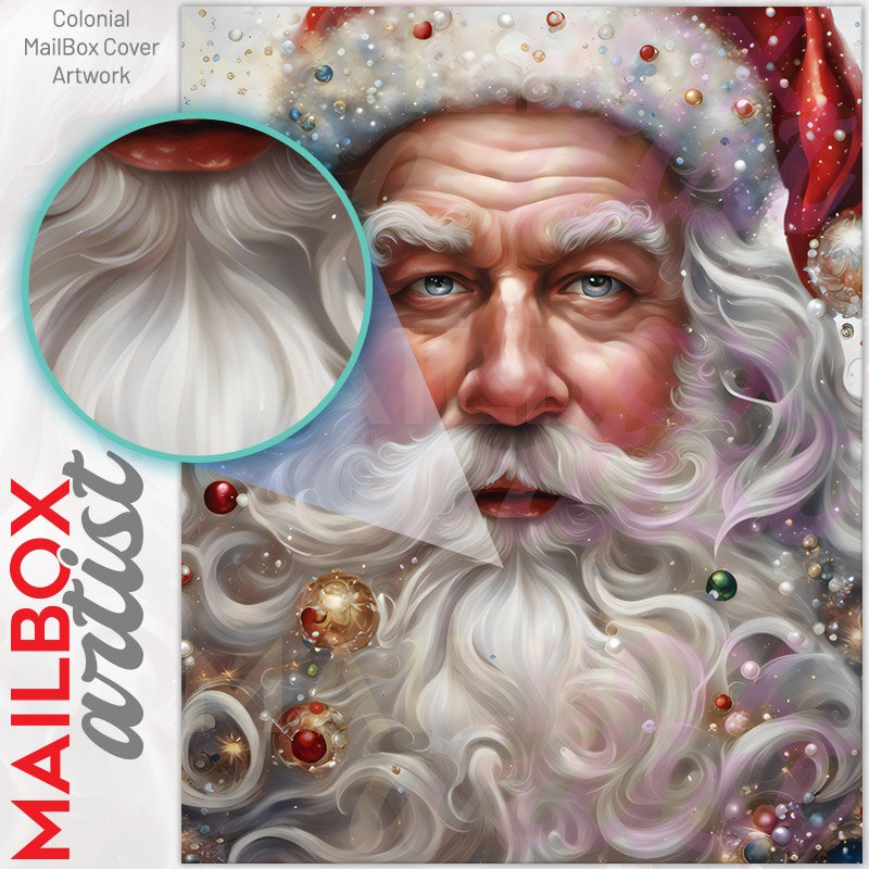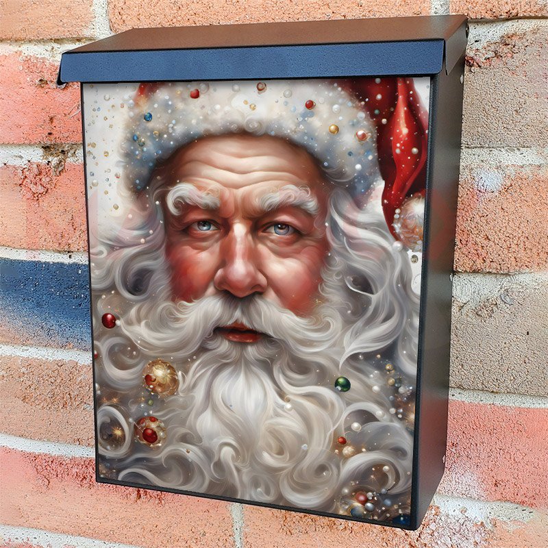 With this Beautiful Santa Portrait colonial mailbox cover it’s pretty easy to convert your mailbox to a special and unique item. These covers require a flat surface, so they work with colonial mailboxes that do not have any embossed decoration or signs. Magnetic mailbox covers work with steel colonial boxes only, while self-adhesive vinyl covers are available for aluminum, plastic and steel boxes. We also offer both self-adhesive and magnetic covers with regular opaque white vinyl or reflective vinyl, which works similarly to license plates or road signs. The reflective option makes the entire cover’s surface reflective, ensuring visibility at night. In case your mailbox doesn’t work with these covers, you can purchase the preinstalled cover on a brand new mailbox as well. Also, you can create your custom colonial mailbox cover using you own pictures, adding your name, street number, etc.