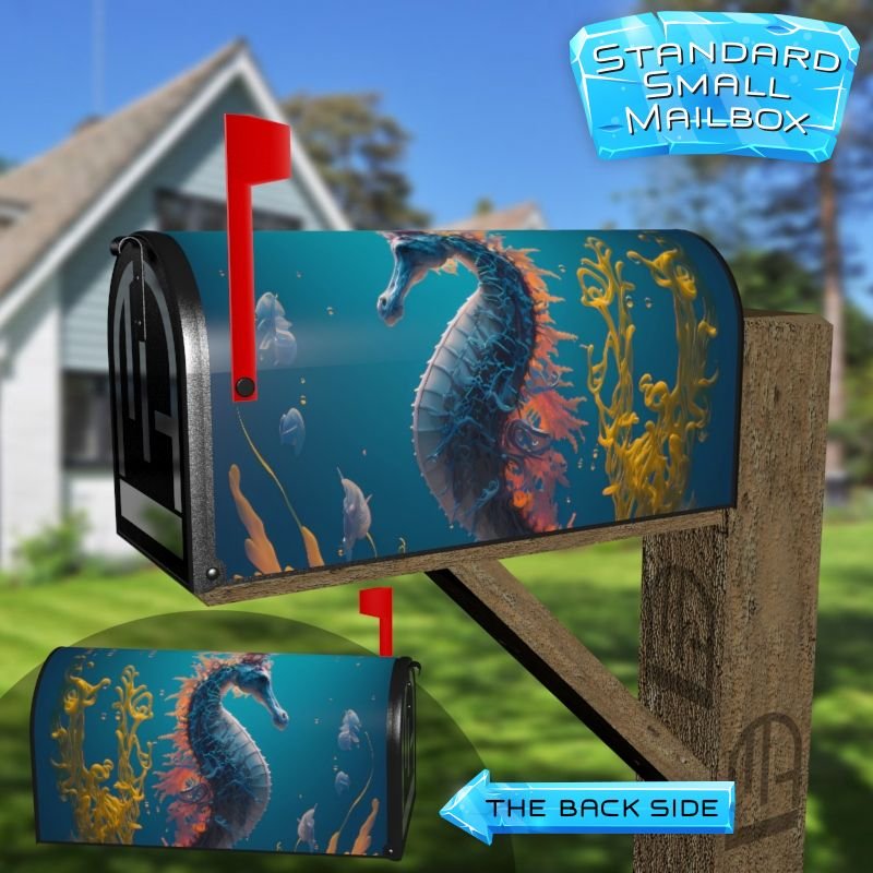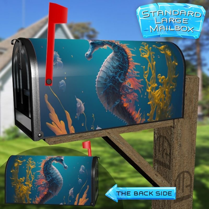 Dressing up your rural farm mailbox with the Beautiful Seahorse #2 mailbox cover is an easy way to convert it into a unique and special item. These covers require a smooth surface, so they are compatible with rural farm mailboxes that do not have any embossed decorations or signs. Magnetic mailbox covers work with steel boxes only, while self-adhesive vinyl covers are available for aluminum, plastic and steel boxes. If your mailbox is not compatible with these covers, you can purchase a brand new mailbox with a preinstalled cover. Additionally, you have the option to create a custom rural farm mailbox cover with your own pictures, name, street number, etc.