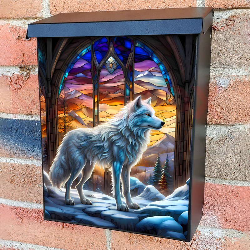 With this Beautiful Stained Glass White Wolf colonial mailbox cover it’s pretty easy to convert your mailbox to a special and unique item. These covers require a flat surface, so they work with colonial mailboxes that do not have any embossed decoration or signs. Magnetic mailbox covers work with steel colonial boxes only, while self-adhesive vinyl covers are available for aluminum, plastic and steel boxes. We also offer both self-adhesive and magnetic covers with regular opaque white vinyl or reflective vinyl, which works similarly to license plates or road signs. The reflective option makes the entire cover’s surface reflective, ensuring visibility at night. In case your mailbox doesn’t work with these covers, you can purchase the preinstalled cover on a brand new mailbox as well. Also, you can create your custom colonial mailbox cover using you own pictures, adding your name, street number, etc.