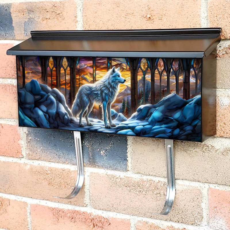 Applying your Beautiful Stained Glass White Wolf townhouse / ranch mailbox cover it’s pretty easy to convert your mailbox to a special and unique item. These covers require a flat surface, so they work with townhouse / ranch mailboxes that do not have any embossed decoration or signs. Magnetic mailbox covers work with steel boxes, for aluminum and plastic boxes we offer the self-adhesive vinyl covers. In case your mailbox doesn’t work with these covers, you can purchase the preinstalled cover on a brand new mailbox as well. Also, you can create your custom townhouse / ranch mailbox cover using you own pictures, adding your name, street number, etc.