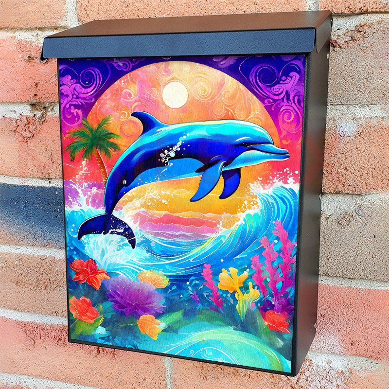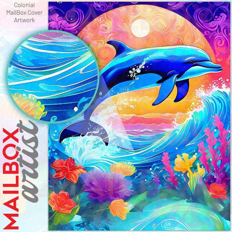 With this Beautiful Tropical Dolphin colonial mailbox cover it’s pretty easy to convert your mailbox to a special and unique item. These covers require a flat surface, so they work with colonial mailboxes that do not have any embossed decoration or signs. Magnetic mailbox covers work with steel colonial boxes only, while self-adhesive vinyl covers are available for aluminum, plastic and steel boxes. We also offer both self-adhesive and magnetic covers with regular opaque white vinyl or reflective vinyl, which works similarly to license plates or road signs. The reflective option makes the entire cover’s surface reflective, ensuring visibility at night. In case your mailbox doesn’t work with these covers, you can purchase the preinstalled cover on a brand new mailbox as well. Also, you can create your custom colonial mailbox cover using you own pictures, adding your name, street number, etc.