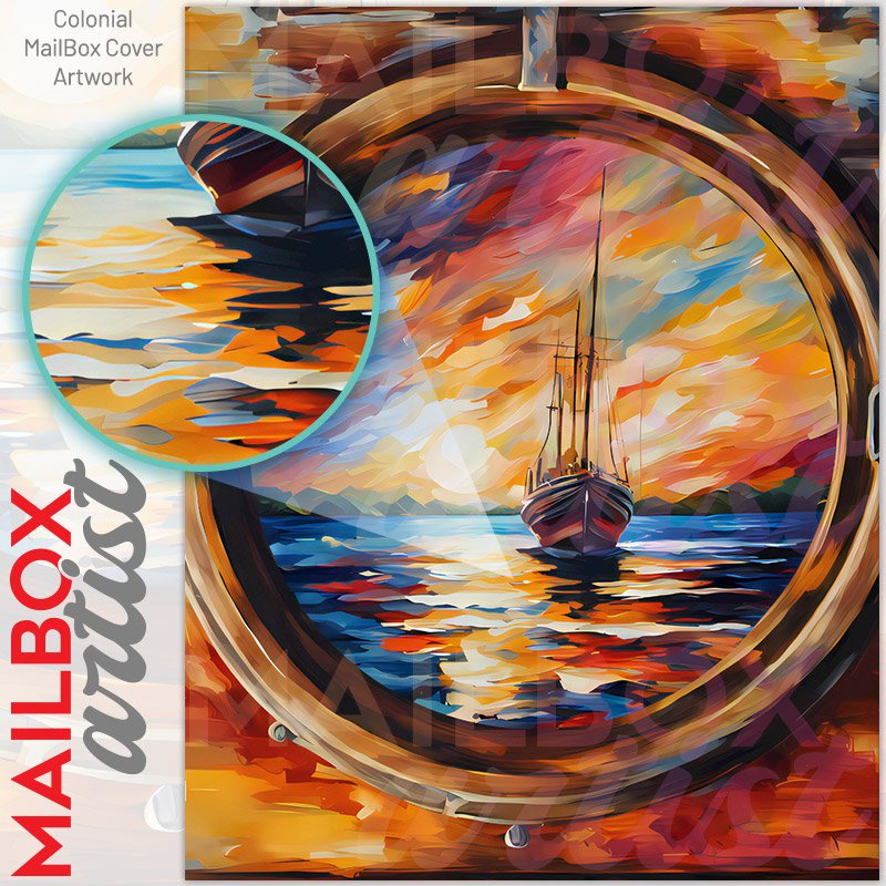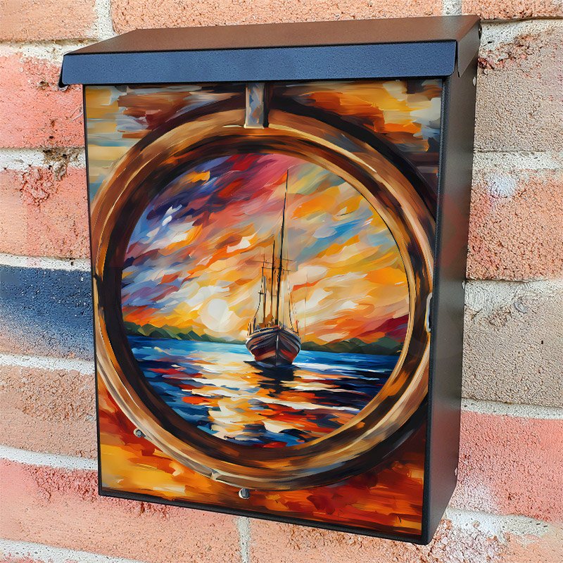 With this Beautiful View Through a Ship Porthole colonial mailbox cover it’s pretty easy to convert your mailbox to a special and unique item. These covers require a flat surface, so they work with colonial mailboxes that do not have any embossed decoration or signs. Magnetic mailbox covers work with steel colonial boxes only, while self-adhesive vinyl covers are available for aluminum, plastic and steel boxes. We also offer both self-adhesive and magnetic covers with regular opaque white vinyl or reflective vinyl, which works similarly to license plates or road signs. The reflective option makes the entire cover’s surface reflective, ensuring visibility at night. In case your mailbox doesn’t work with these covers, you can purchase the preinstalled cover on a brand new mailbox as well. Also, you can create your custom colonial mailbox cover using you own pictures, adding your name, street number, etc.