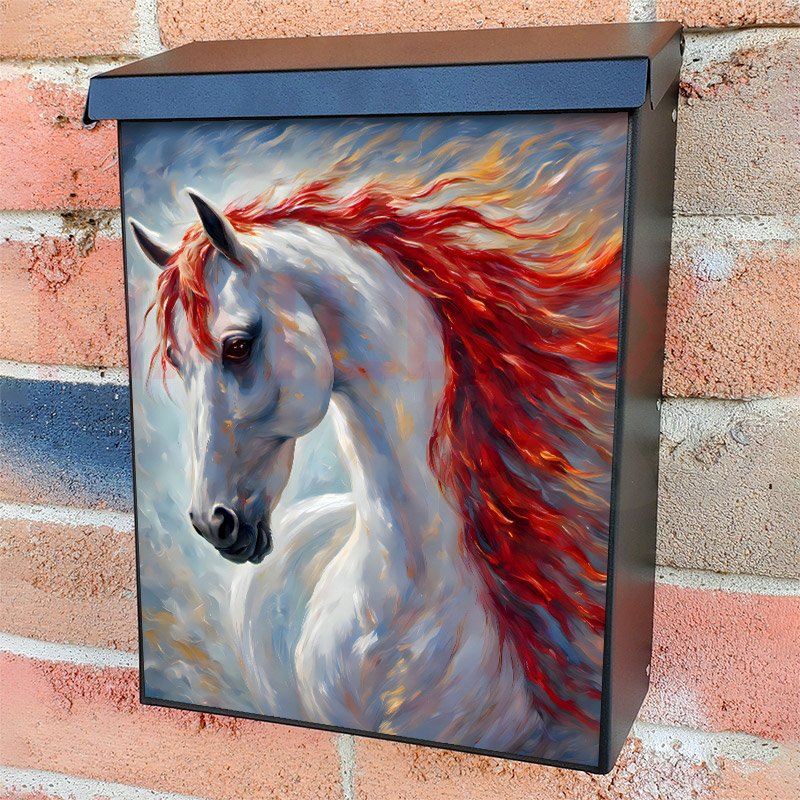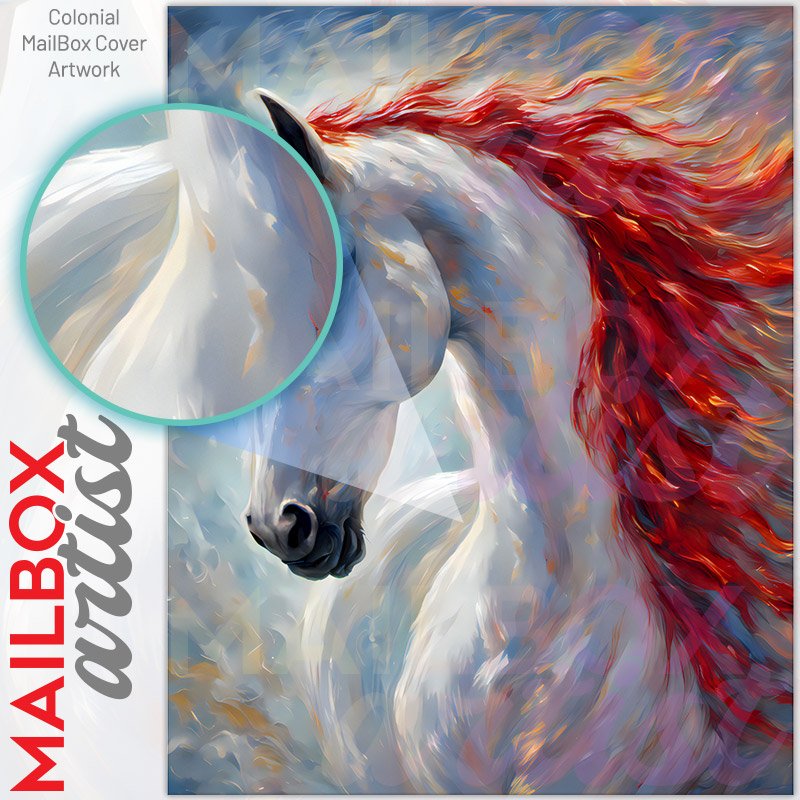 With this Beautiful White Stallion Portrait colonial mailbox cover it’s pretty easy to convert your mailbox to a special and unique item. These covers require a flat surface, so they work with colonial mailboxes that do not have any embossed decoration or signs. Magnetic mailbox covers work with steel colonial boxes only, while self-adhesive vinyl covers are available for aluminum, plastic and steel boxes. We also offer both self-adhesive and magnetic covers with regular opaque white vinyl or reflective vinyl, which works similarly to license plates or road signs. The reflective option makes the entire cover’s surface reflective, ensuring visibility at night. In case your mailbox doesn’t work with these covers, you can purchase the preinstalled cover on a brand new mailbox as well. Also, you can create your custom colonial mailbox cover using you own pictures, adding your name, street number, etc.