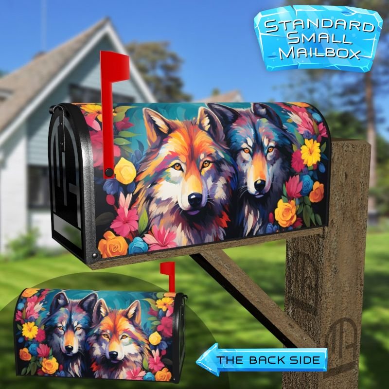 Dressing up your rural farm mailbox with the Beautiful Wolf Couple #2 mailbox cover is an easy way to convert it into a unique and special item. These covers require a smooth surface, so they are compatible with rural farm mailboxes that do not have any embossed decorations or signs. Magnetic mailbox covers work with steel boxes only, while self-adhesive vinyl covers are available for aluminum, plastic and steel boxes. If your mailbox is not compatible with these covers, you can purchase a brand new mailbox with a preinstalled cover. Additionally, you have the option to create a custom rural farm mailbox cover with your own pictures, name, street number, etc.