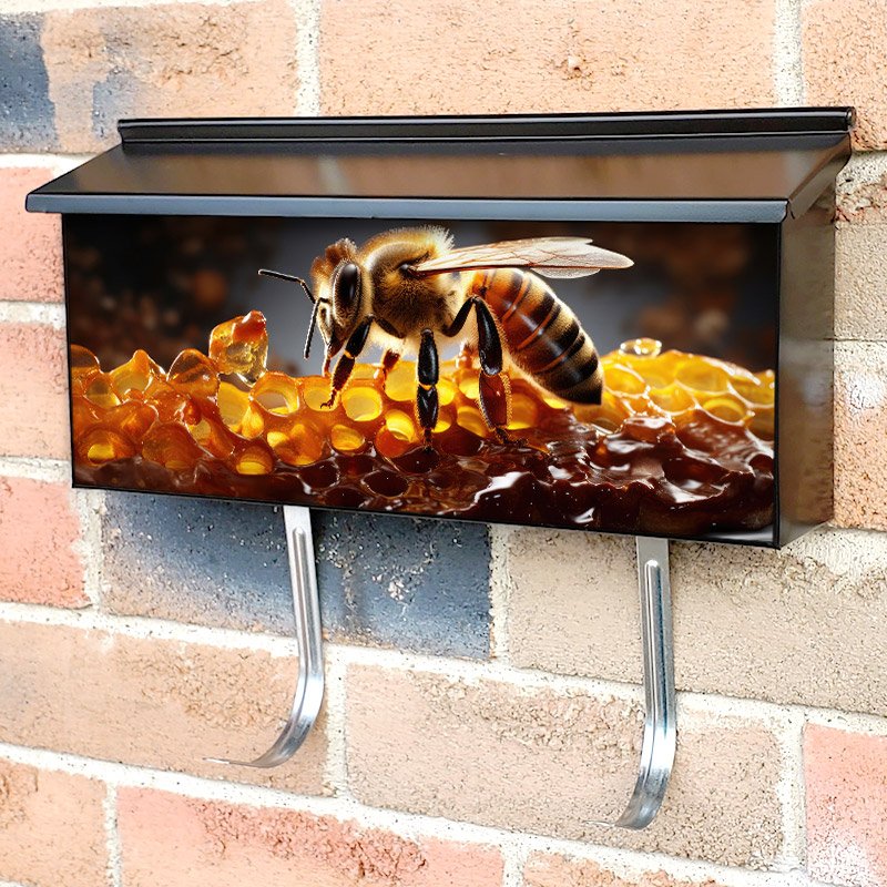 Applying your Bee Eating Honey townhouse / ranch mailbox cover it’s pretty easy to convert your mailbox to a special and unique item. These covers require a flat surface, so they work with townhouse / ranch mailboxes that do not have any embossed decoration or signs. Magnetic mailbox covers work with steel boxes, for aluminum and plastic boxes we offer the self-adhesive vinyl covers. In case your mailbox doesn’t work with these covers, you can purchase the preinstalled cover on a brand new mailbox as well. Also, you can create your custom townhouse / ranch mailbox cover using you own pictures, adding your name, street number, etc.