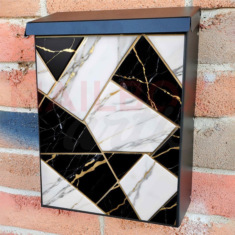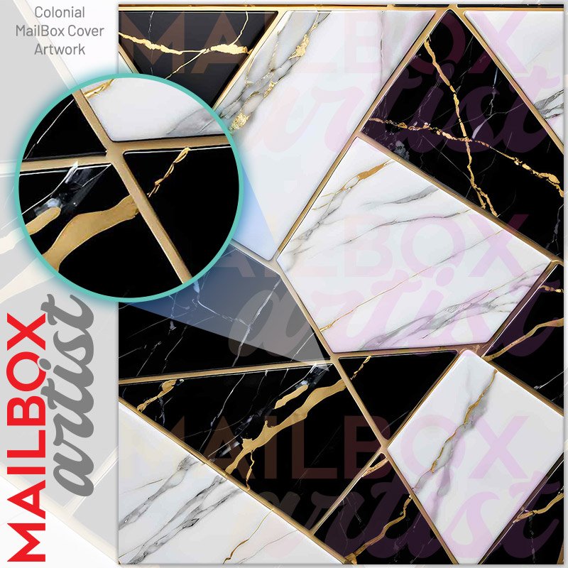 With this Black, Gold and White Marble Design colonial mailbox cover it’s pretty easy to convert your mailbox to a special and unique item. These covers require a flat surface, so they work with colonial mailboxes that do not have any embossed decoration or signs. Magnetic mailbox covers work with steel colonial boxes only, while self-adhesive vinyl covers are available for aluminum, plastic and steel boxes. We also offer both self-adhesive and magnetic covers with regular opaque white vinyl or reflective vinyl, which works similarly to license plates or road signs. The reflective option makes the entire cover’s surface reflective, ensuring visibility at night. In case your mailbox doesn’t work with these covers, you can purchase the preinstalled cover on a brand new mailbox as well. Also, you can create your custom colonial mailbox cover using you own pictures, adding your name, street number, etc.