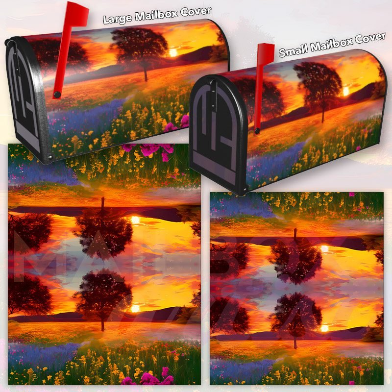 Dressing up your rural farm mailbox with the Blazing Summer Sunset mailbox cover is an easy way to convert it into a unique and special item. These covers require a smooth surface, so they are compatible with rural farm mailboxes that do not have any embossed decorations or signs. Magnetic mailbox covers work with steel boxes only, while self-adhesive vinyl covers are available for aluminum, plastic and steel boxes. If your mailbox is not compatible with these covers, you can purchase a brand new mailbox with a preinstalled cover. Additionally, you have the option to create a custom rural farm mailbox cover with your own pictures, name, street number, etc.