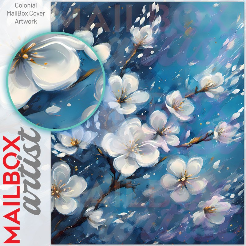 With this Blooming White Blossoms colonial mailbox cover it’s pretty easy to convert your mailbox to a special and unique item. These covers require a flat surface, so they work with colonial mailboxes that do not have any embossed decoration or signs. Magnetic mailbox covers work with steel colonial boxes only, while self-adhesive vinyl covers are available for aluminum, plastic and steel boxes. We also offer both self-adhesive and magnetic covers with regular opaque white vinyl or reflective vinyl, which works similarly to license plates or road signs. The reflective option makes the entire cover’s surface reflective, ensuring visibility at night. In case your mailbox doesn’t work with these covers, you can purchase the preinstalled cover on a brand new mailbox as well. Also, you can create your custom colonial mailbox cover using you own pictures, adding your name, street number, etc.
