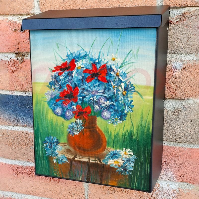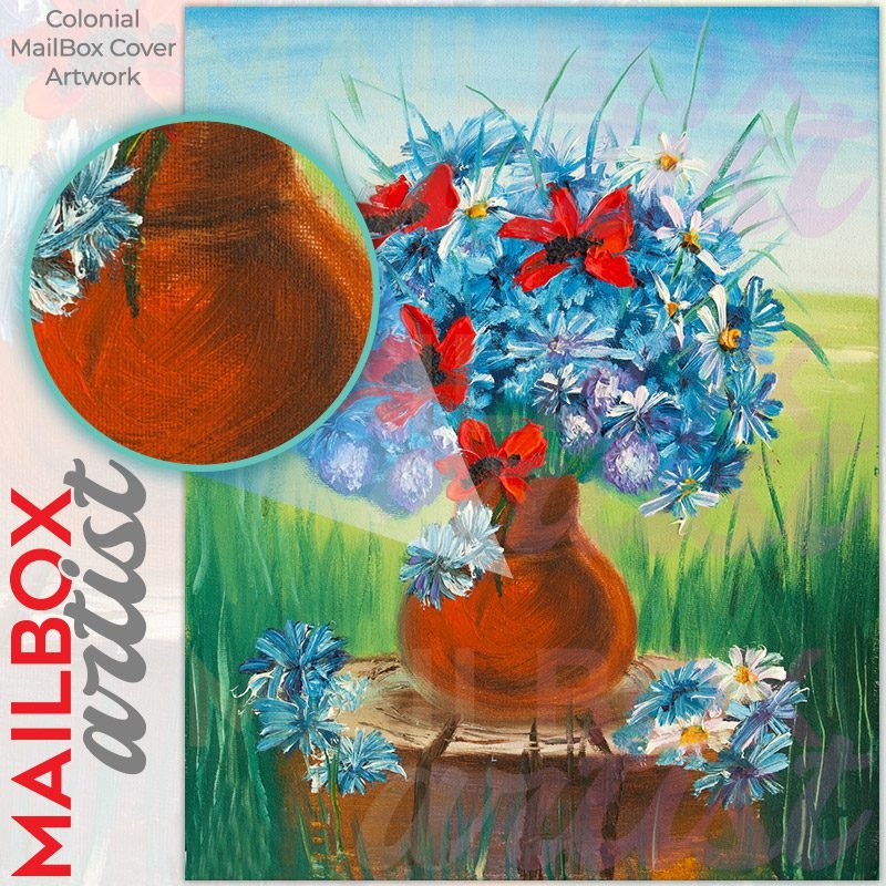 With this Blue Red and White Garden Flowers #2 colonial mailbox cover it’s pretty easy to convert your mailbox to a special and unique item. These covers require a flat surface, so they work with colonial mailboxes that do not have any embossed decoration or signs. Magnetic mailbox covers work with steel colonial boxes only, while self-adhesive vinyl covers are available for aluminum, plastic and steel boxes. We also offer both self-adhesive and magnetic covers with regular opaque white vinyl or reflective vinyl, which works similarly to license plates or road signs. The reflective option makes the entire cover’s surface reflective, ensuring visibility at night. In case your mailbox doesn’t work with these covers, you can purchase the preinstalled cover on a brand new mailbox as well. Also, you can create your custom colonial mailbox cover using you own pictures, adding your name, street number, etc.