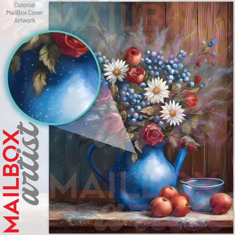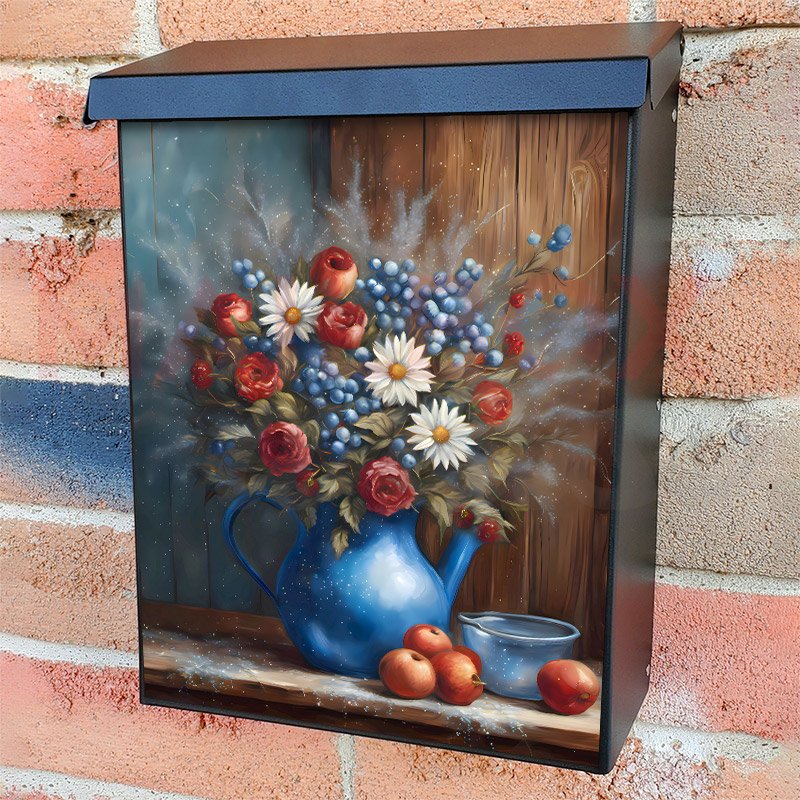 With this Blue Teapot with Flowers and Fruit colonial mailbox cover it’s pretty easy to convert your mailbox to a special and unique item. These covers require a flat surface, so they work with colonial mailboxes that do not have any embossed decoration or signs. Magnetic mailbox covers work with steel colonial boxes only, while self-adhesive vinyl covers are available for aluminum, plastic and steel boxes. We also offer both self-adhesive and magnetic covers with regular opaque white vinyl or reflective vinyl, which works similarly to license plates or road signs. The reflective option makes the entire cover’s surface reflective, ensuring visibility at night. In case your mailbox doesn’t work with these covers, you can purchase the preinstalled cover on a brand new mailbox as well. Also, you can create your custom colonial mailbox cover using you own pictures, adding your name, street number, etc.