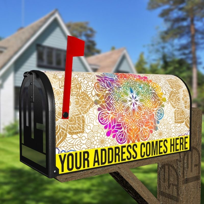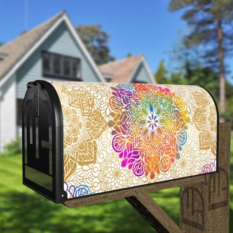 Grab this creative Bohemian Folk Art Ethnic Mandala Design #3 rural/curbside/farm mailbox cover as self adhesive vinyl or magnetic cover. Our magnetic covers have the magnetic surface under the whole design, not only two magnet strips like in cheaper products. We also offer both the self adhesive and the magnetic covers with regular opaque white vinyl or reflective vinyl which works the same way as the licence plates or road signs; pretty visible at night. We make these covers for both large and small mailboxes.