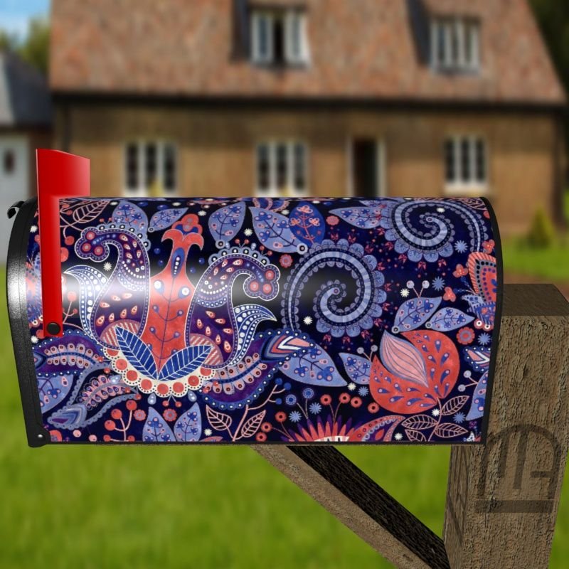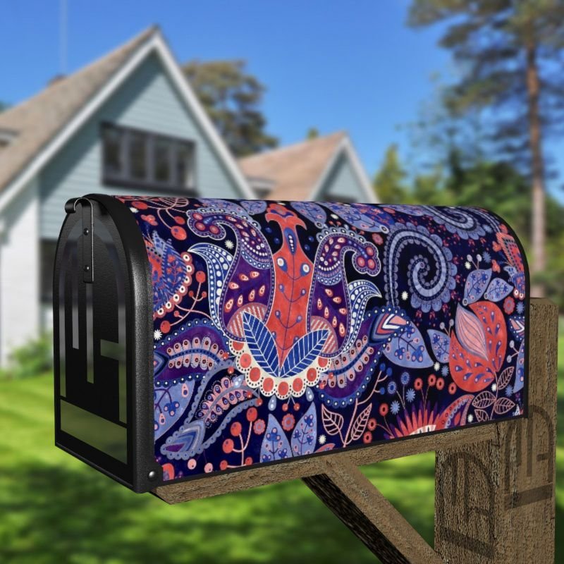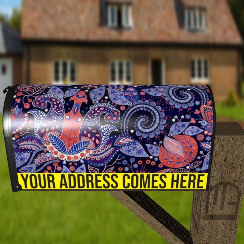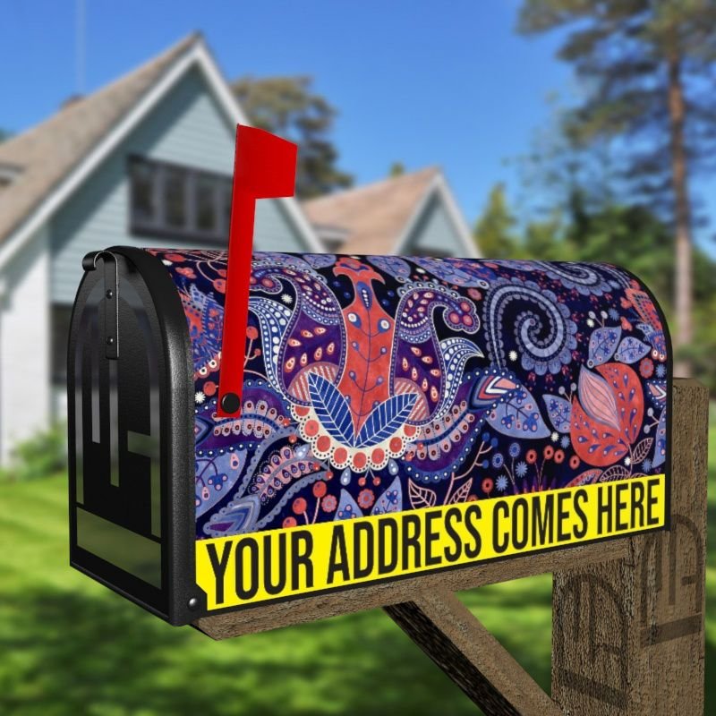 Grab this creative Bohemian Folk Art Ethnic Paisley Design #6 rural/curbside/farm mailbox cover as self adhesive vinyl or magnetic cover. Our magnetic covers have the magnetic surface under the whole design, not only two magnet strips like in cheaper products. We also offer both the self adhesive and the magnetic covers with regular opaque white vinyl or reflective vinyl which works the same way as the licence plates or road signs; pretty visible at night. We make these covers for both large and small mailboxes.
