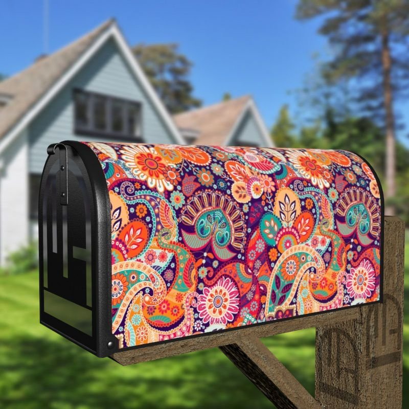Grab this creative Bohemian Folk Art Ethnic Paisley Design #7 rural/curbside/farm mailbox cover as self adhesive vinyl or magnetic cover. Our magnetic covers have the magnetic surface under the whole design, not only two magnet strips like in cheaper products. We also offer both the self adhesive and the magnetic covers with regular opaque white vinyl or reflective vinyl which works the same way as the licence plates or road signs; pretty visible at night. We make these covers for both large and small mailboxes.
